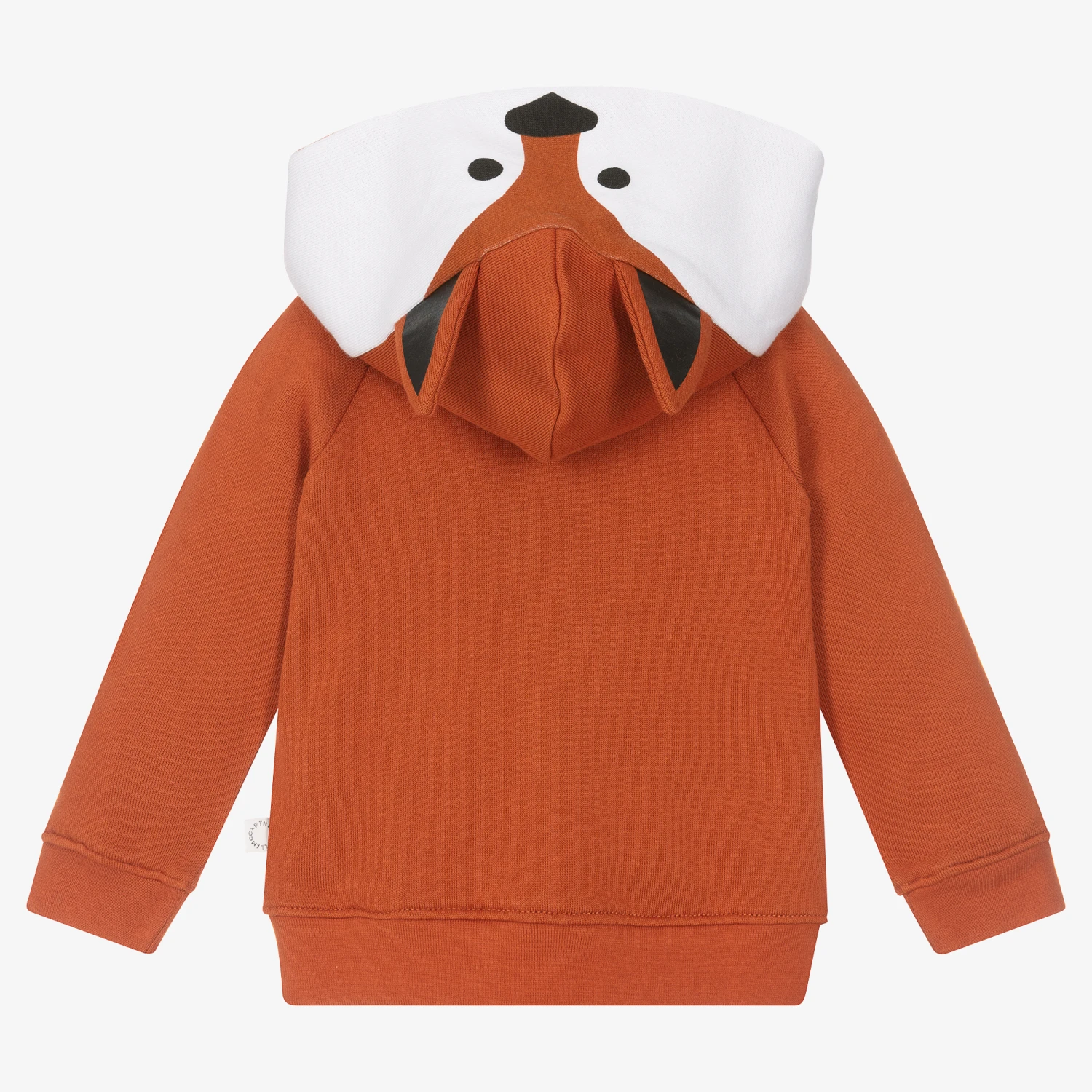 An adorable brown zip-up top for little boys by British fashion label Stella McCartney Kids, made in mid-weight organic cotton jersey. Warm and cosy, it has narrow ribbed trims and a fun 3D fox character print on the hood for added charm. It has a zip fastening on the front with a protective zip guard for added comfort.