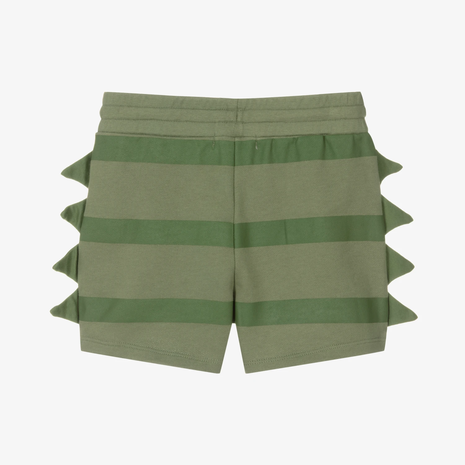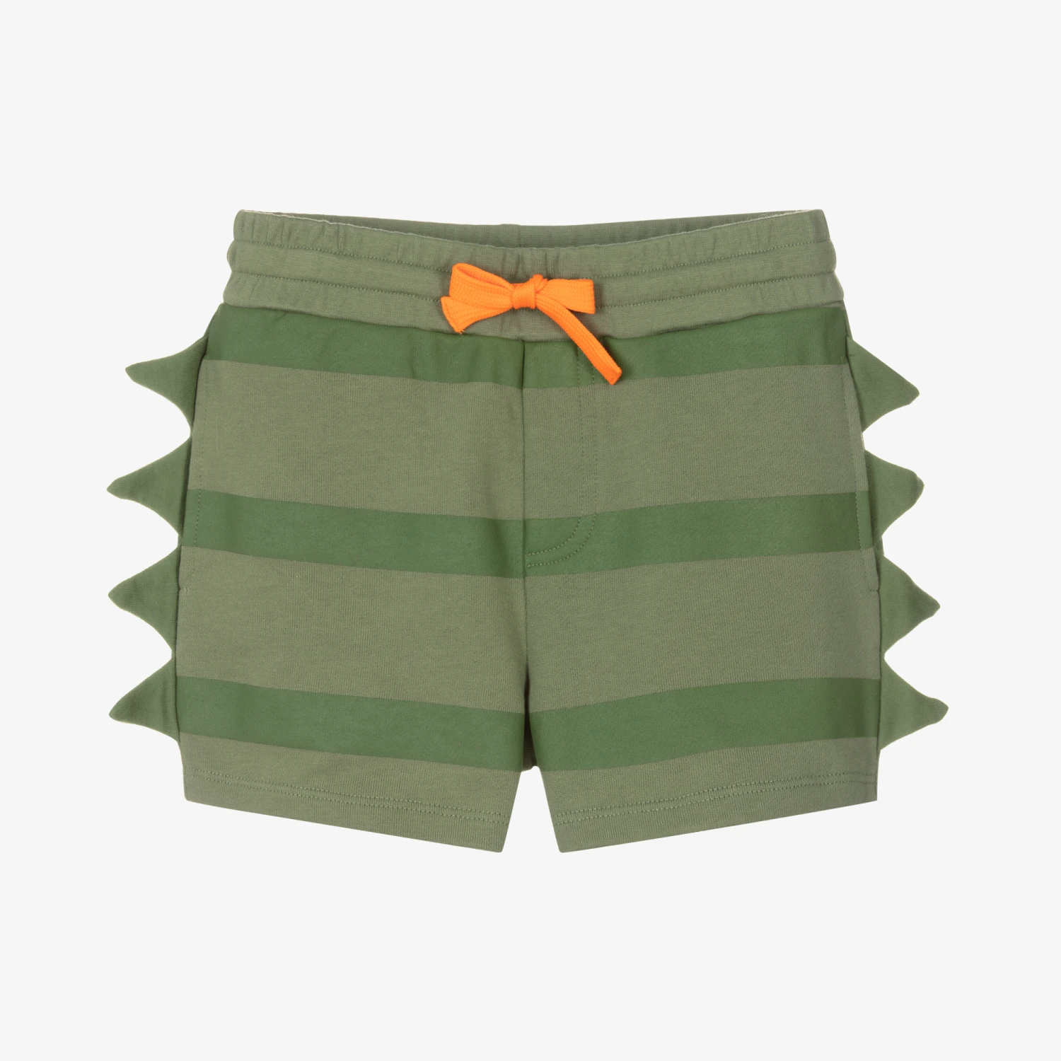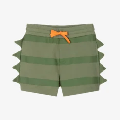 Striped shorts for boys in contrasting shades of green, by British designer, Stella McCartney Kids. Made in comfortable organic cotton sweatshirt jersey, they have useful concealed side pockets and fun 3D ‘spine’ detail along the side seams. The waistband is elasticated and fastens with a vibrant orange drawstring for an adjustable fit. The Stella McCartney fit can be quite small so choose a size up if you want room to grow.