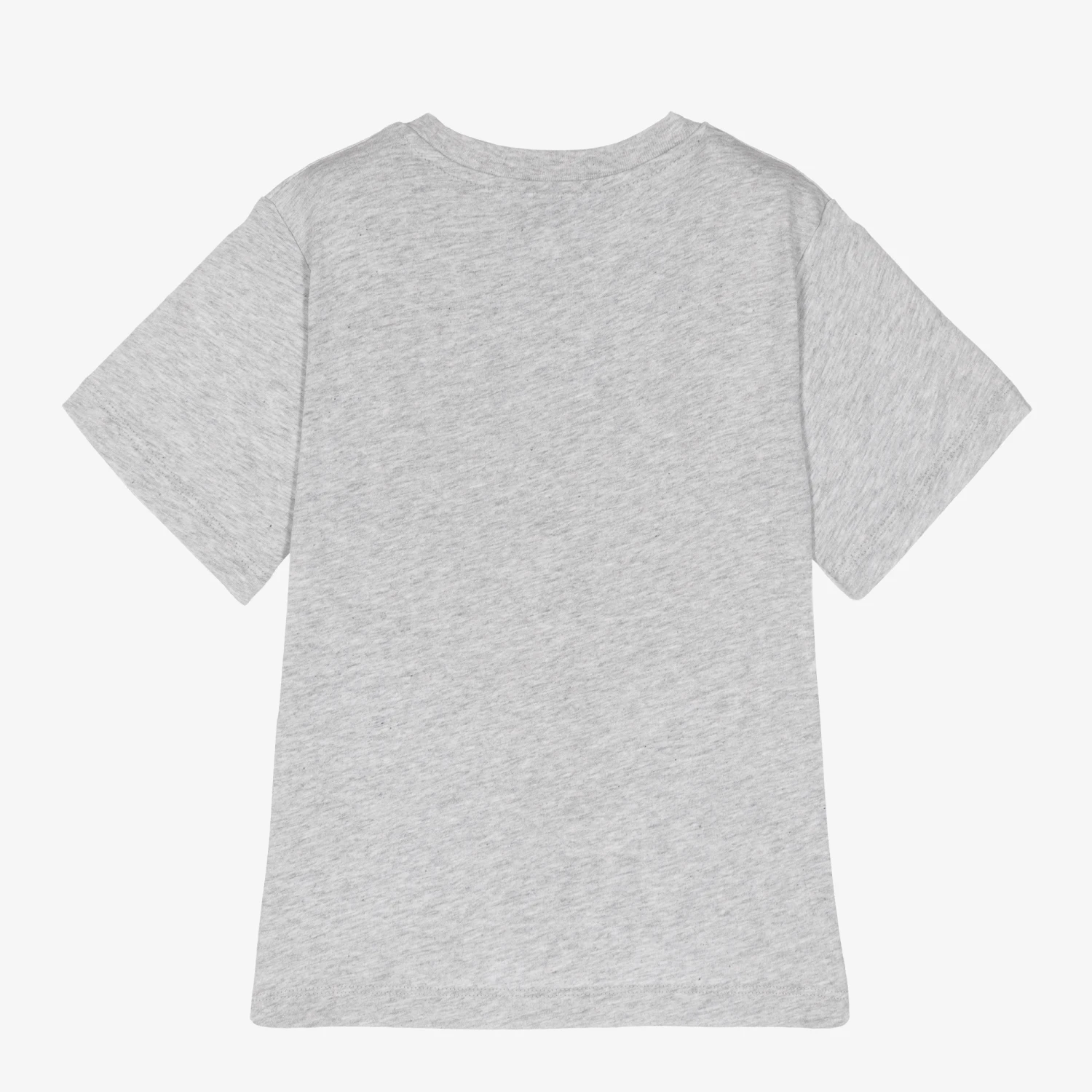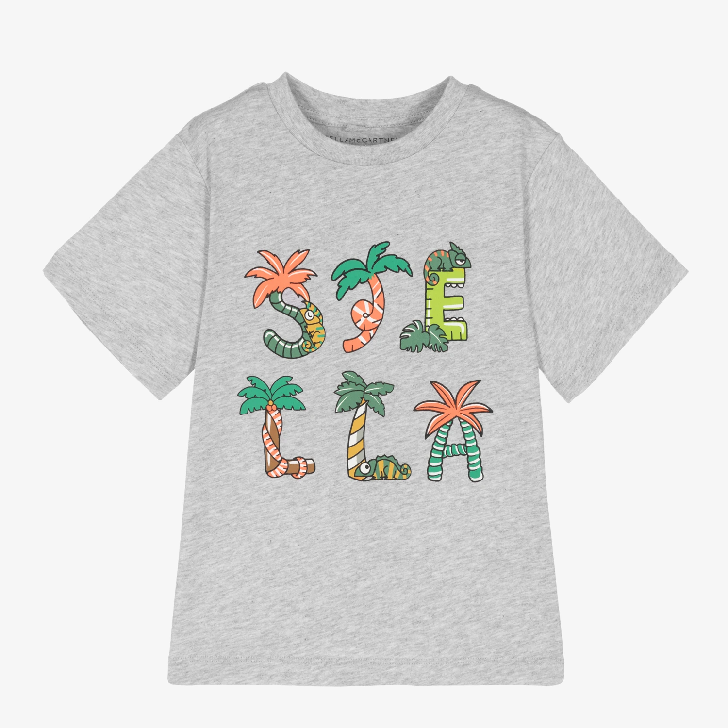 Fun grey marl crew neck T-shirt for boys from British designer Stella McCartney Kids. It has a playful logo on the front, printed in neon orange and green with palm trees and geckos. Comfortable and casual for everyday, it is made with sustainable organic cotton jersey.