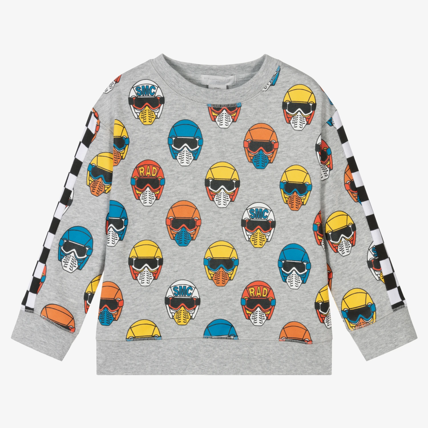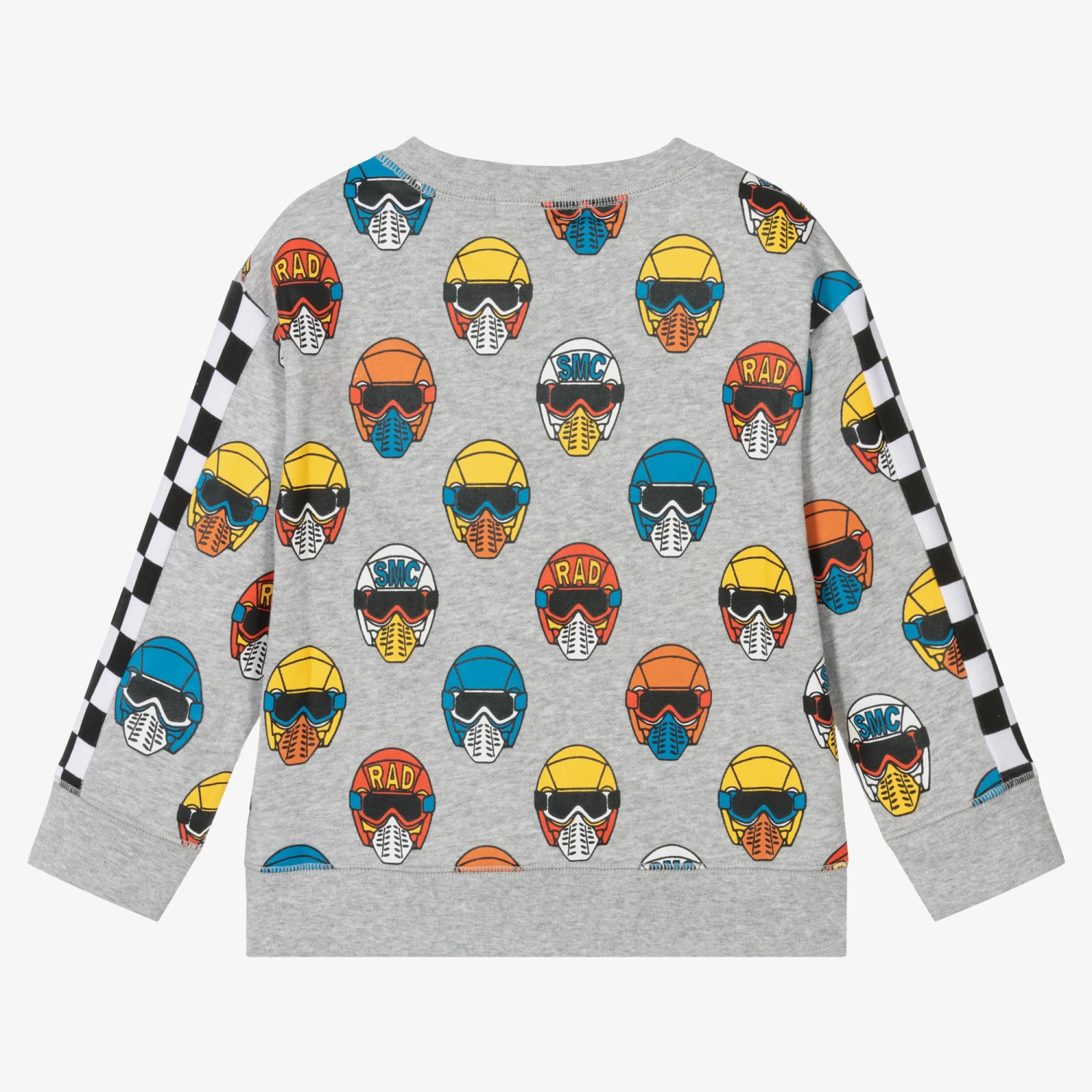 Grey motorcross-inspired sweatshirt for boys by Stella McCartney Kids, with a fun and colourful helmet pattern. Made in comfortable organic cotton jersey with a cosy brushed feel inside, it has black and white checked trim on the sleeves to complete the look.