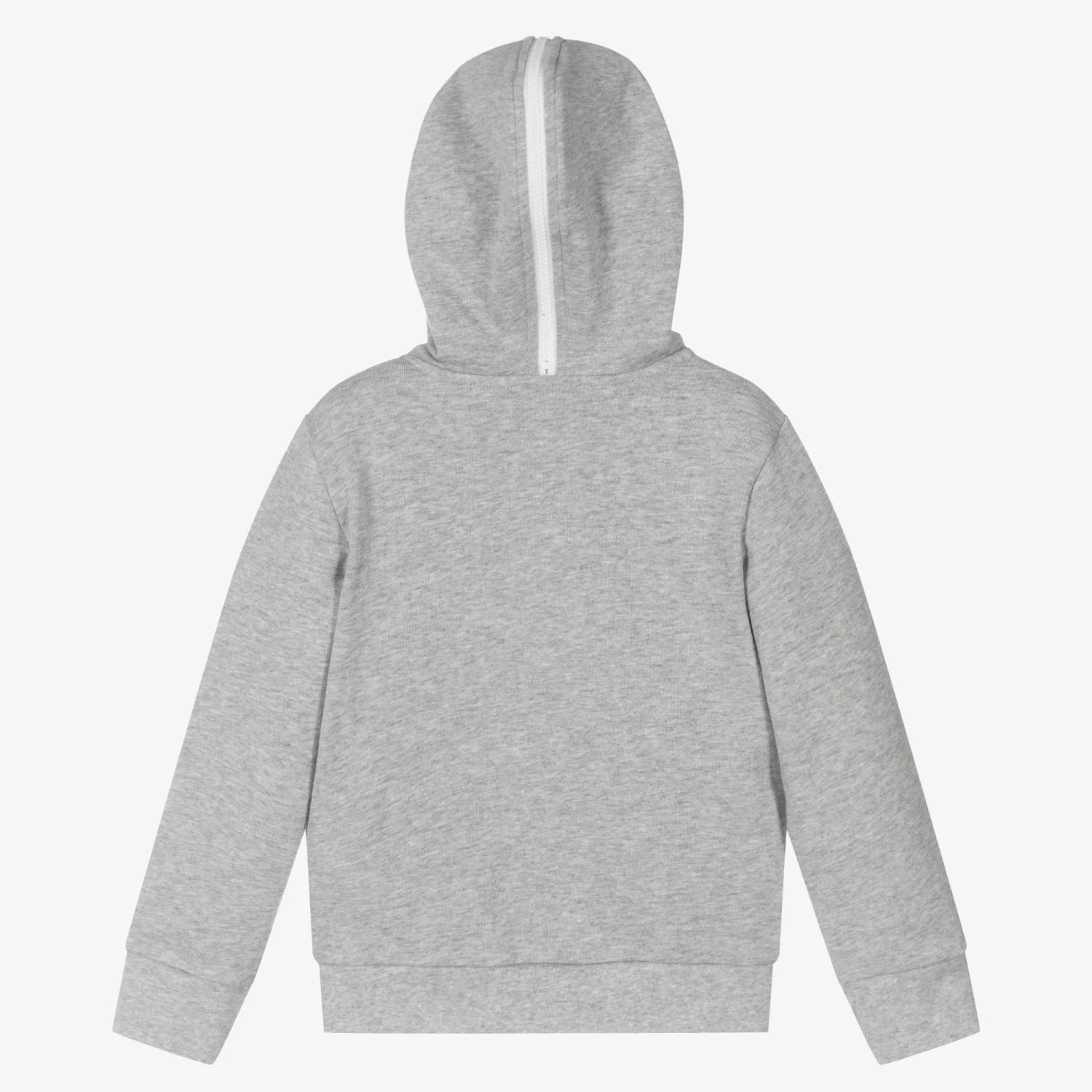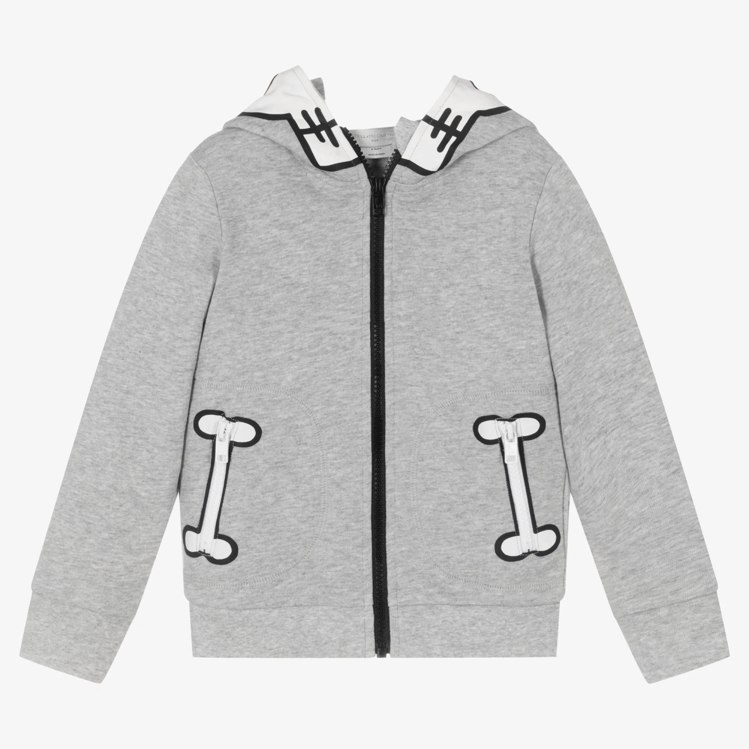 Grey marl zip-up hoodie for boys by British brand, Stella McCartney Kids. A fun design, it has a white skull mask hood with mesh eye inserts and an exposed white zip. It is made in comfortable organic cotton jersey, with a black zip fastening on the front, and zip-up pockets with white bone prints. The Stella McCartney fit can be quite small so choose a size up if you want room to grow.