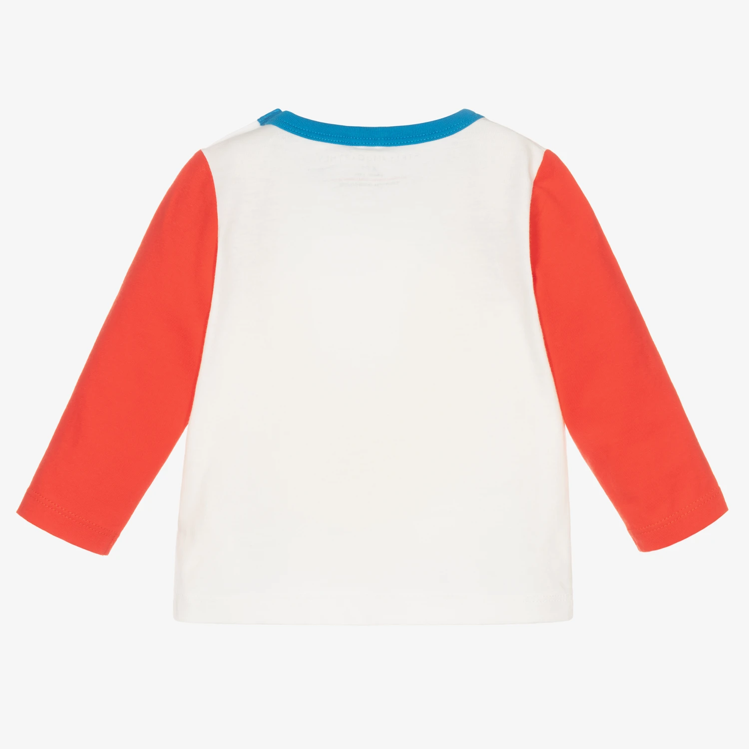 Off-white long sleeved top for little boys by Stella McCartney Kids, made in soft organic cotton jersey. The blue trimmed crew neckline and red sleeves give a quirky finish to a classic top. It has a large smiling and happy shape printed on the front and the poppers on one shoulder make dressing easy.