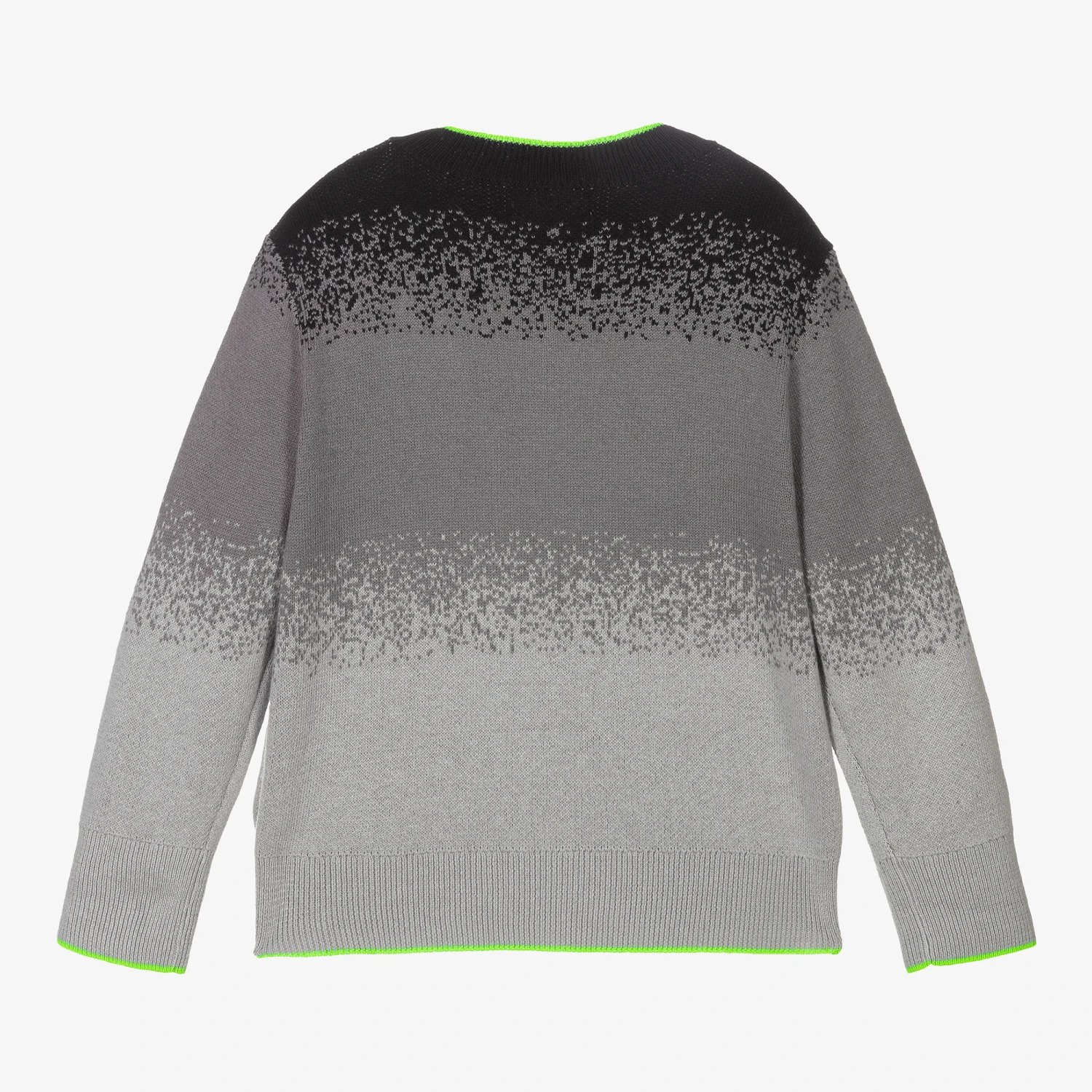 Boys Stella McCartney Kids jumper, knitted in a soft organic cotton and wool blend. It has a graduated spray paint effect in black and grey, with neon green trim on the ribbed collar, cuffs and hem.
