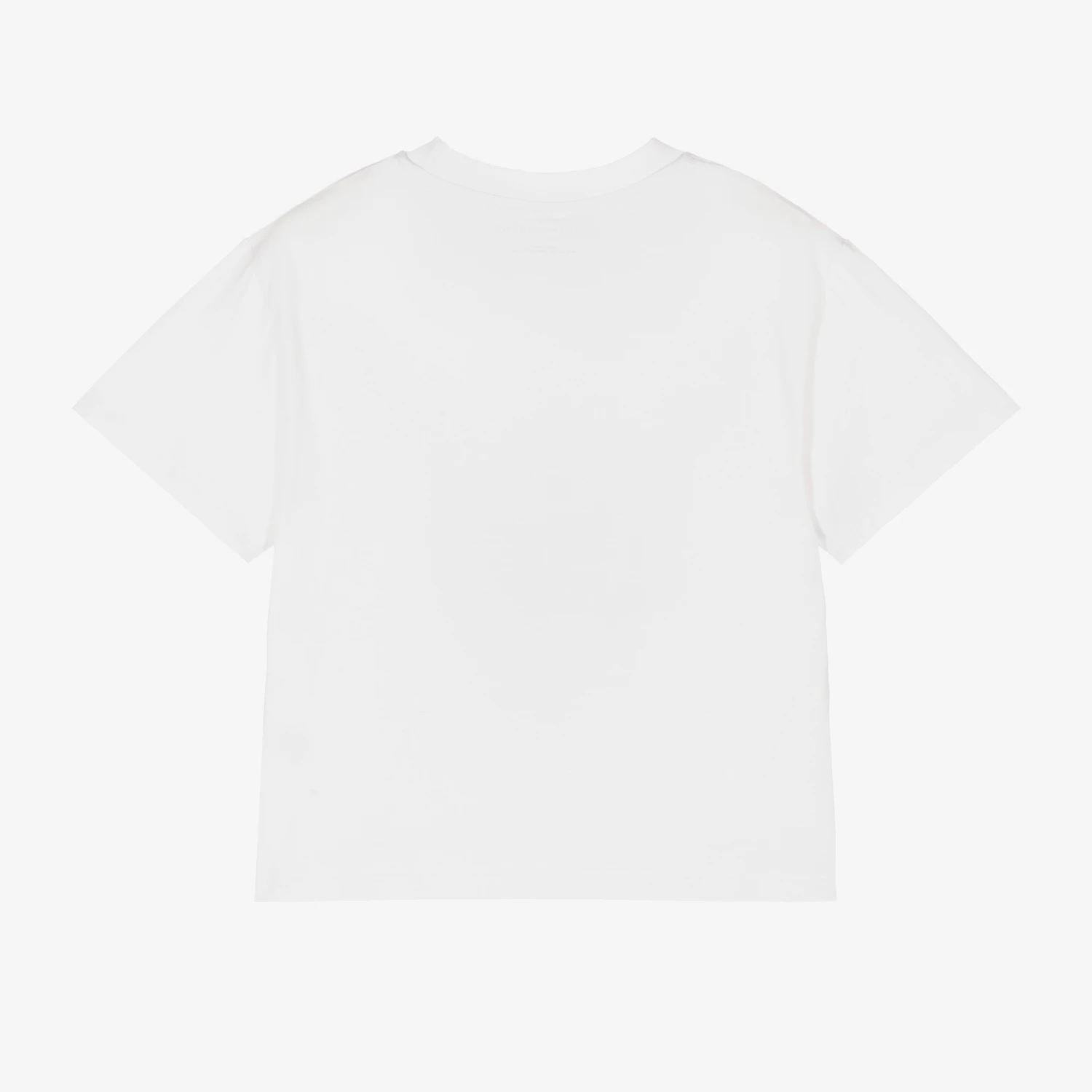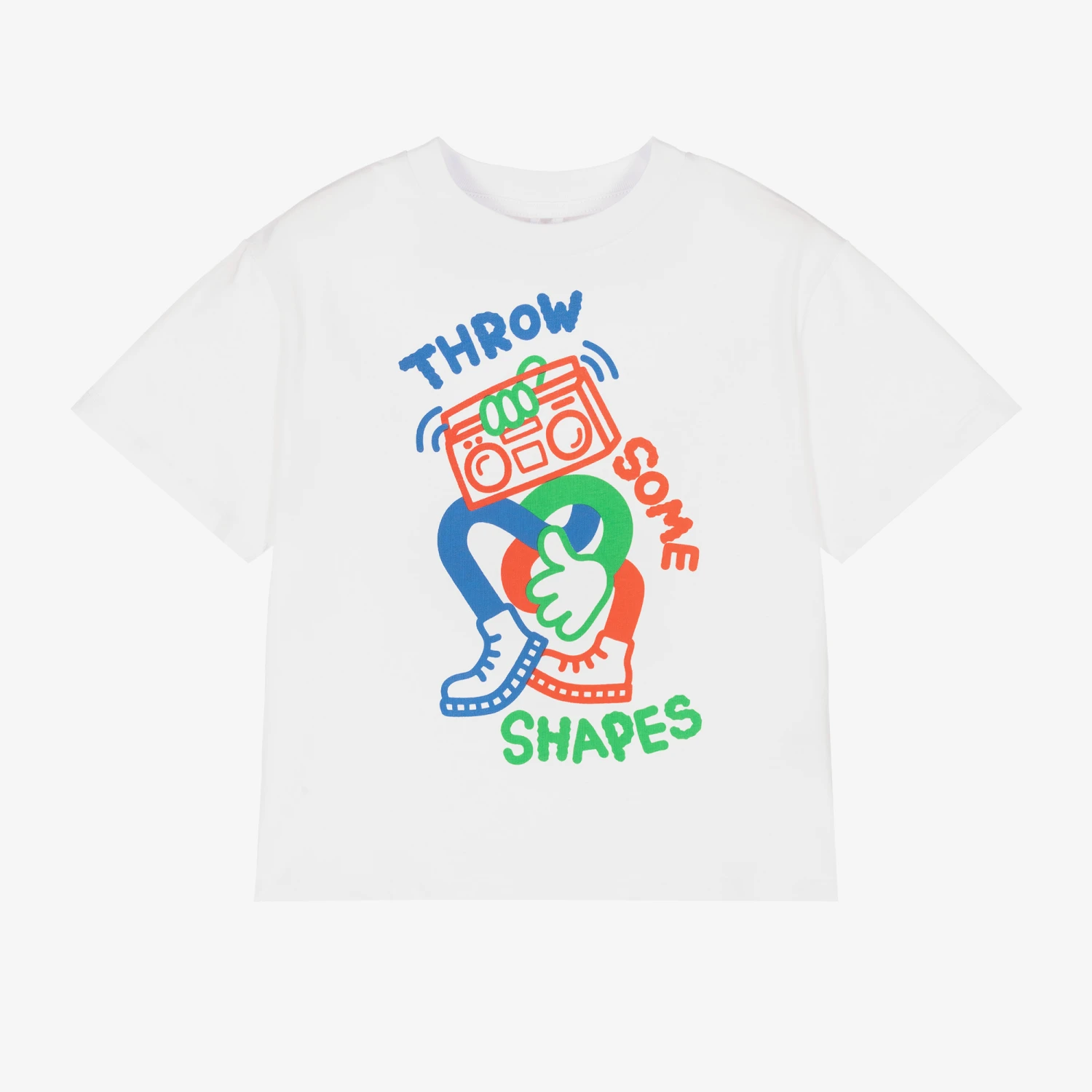 This white T-shirt for boys from Stella McCartney Kids is made in soft and stretchy organic cotton. In blue, red and green, a quirky dancing character is stamped on the front, complete with a retro boombox and ‘Throw Some Shapes’ lettering. The Stella McCartney fit can be quite small so choose a size up if you want room to grow.