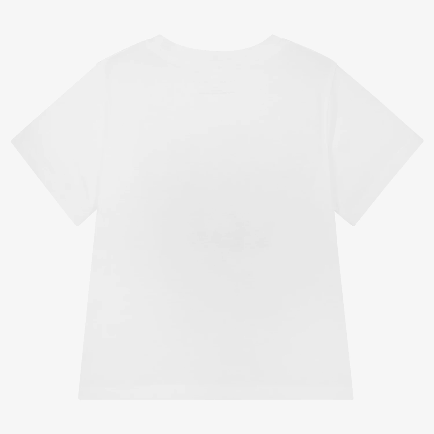White crew neck T-shirt for boys by Stella McCartney Kids, made in soft organic cotton jersey. The front is printed with a fun ‘Spec-Taco-Lar’ slogan and has a colourful cartoon taco printed underneath for a quirky, playful look.