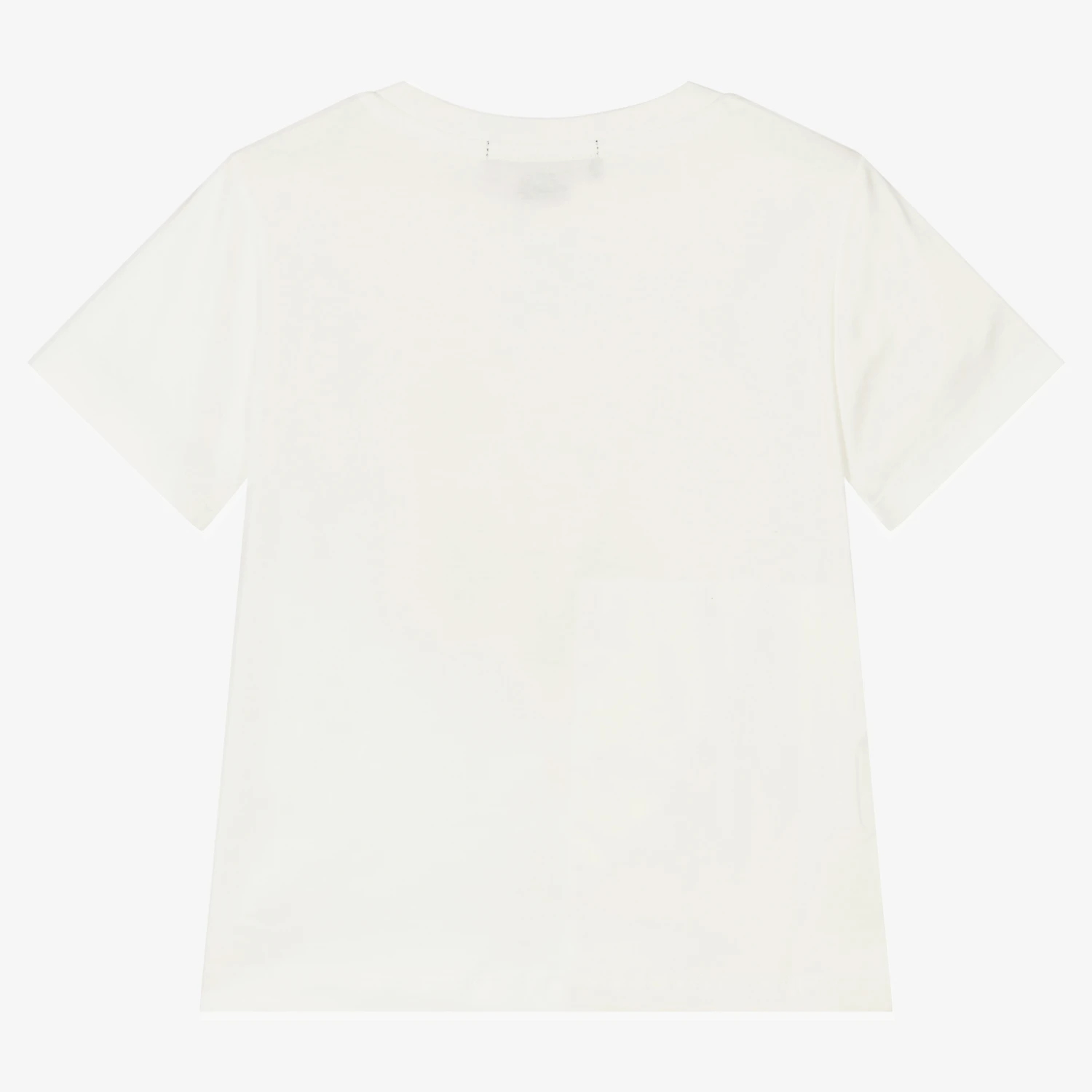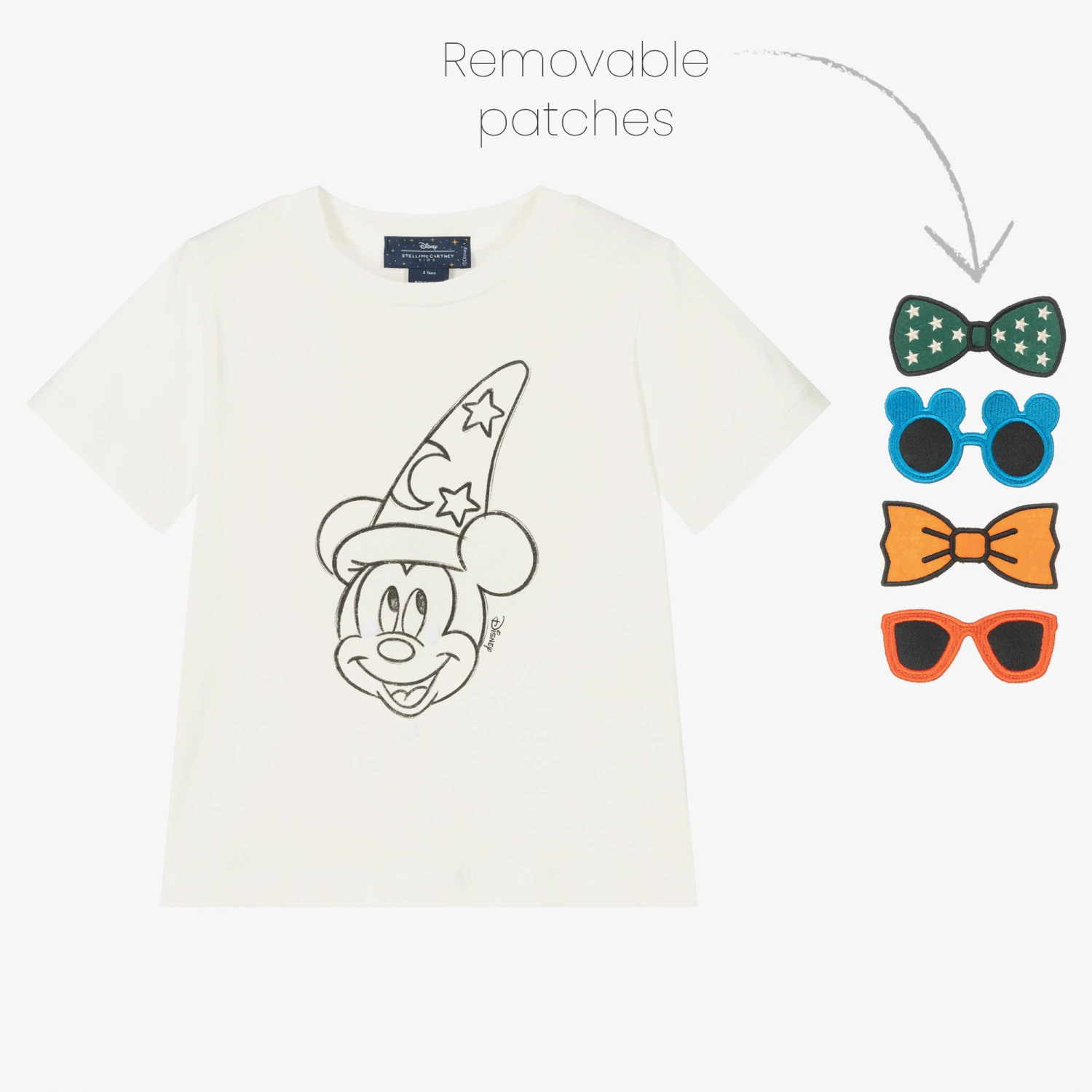 An ivory organic cotton T-shirt for boys from British label Stella McCartney Kids. Forming part of Disney© Fantasia capsule collection, this cool design features a Mickey Mouse outline print with interactive accessories, including two pairs of orange and blue sunglasses, and green and orange bow ties. These embroidered accessories attach with velcro, and can be stored in a useful hidden velcro-fastening side pocket to keep them safe.