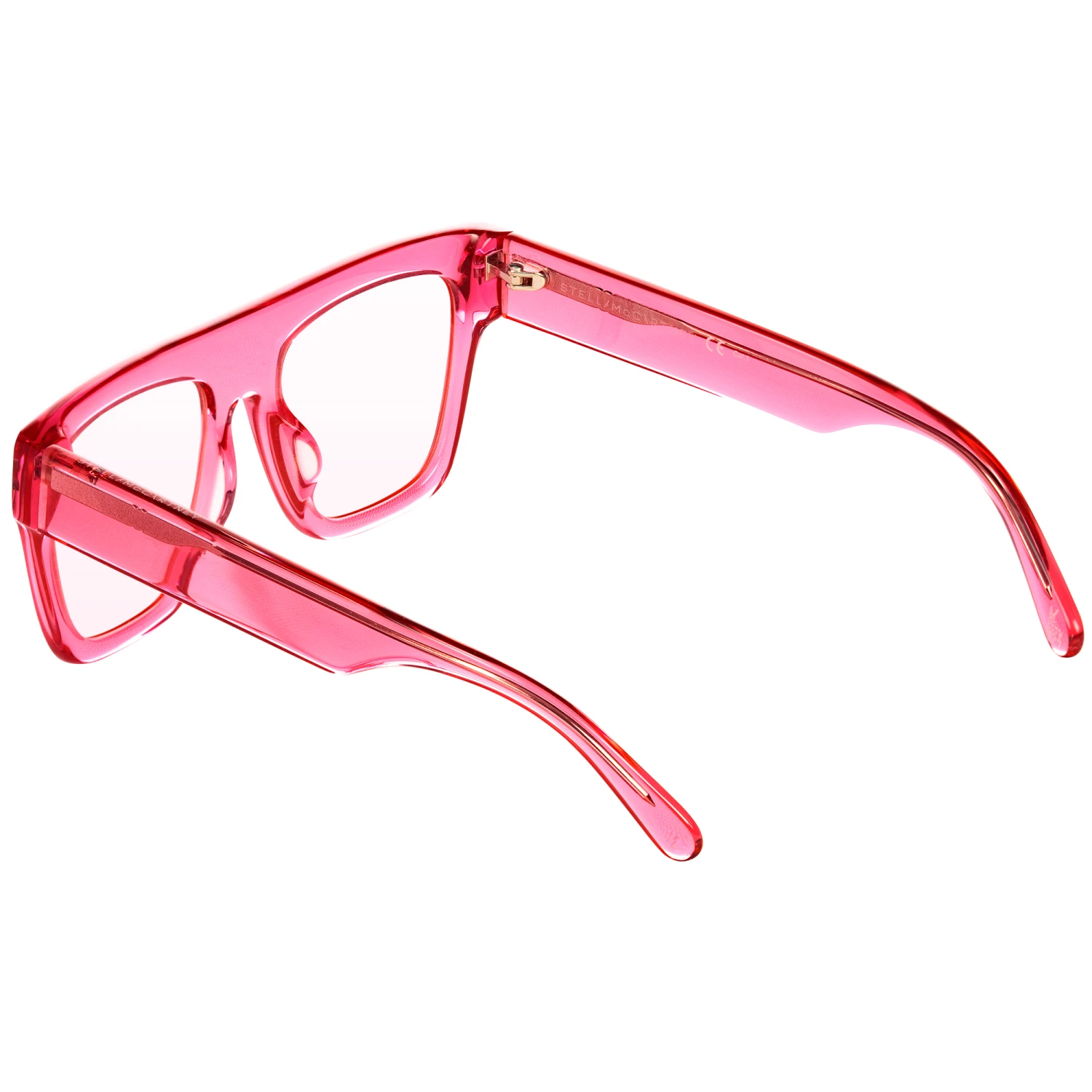 Stella McCartney Kids cosmetic use sunglasses, suitable for boys and girls made from bio acetate. The rectangular frames are in semi-transparent pink and they have matching light tinted lenses. They come with a neoprene case for safe storage.