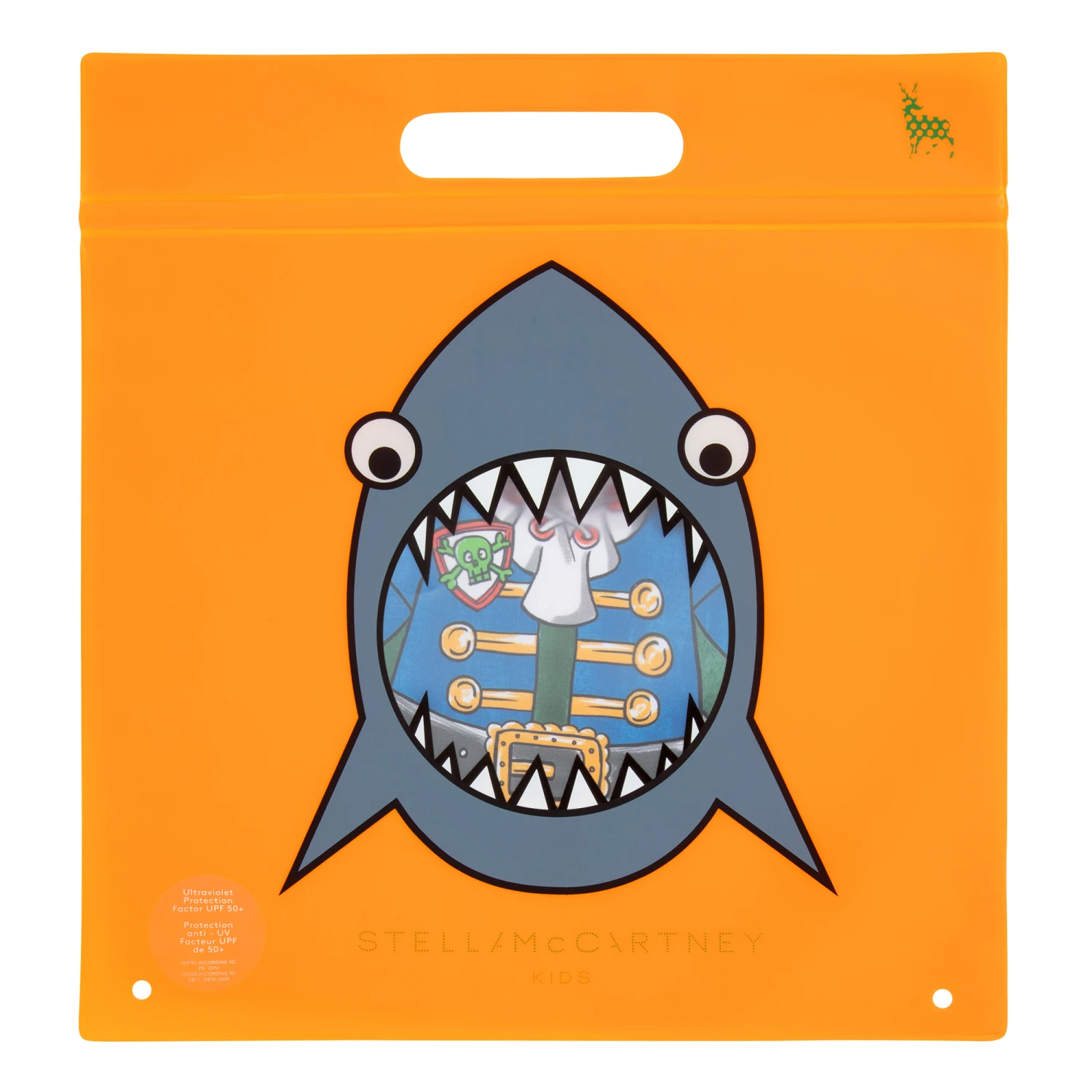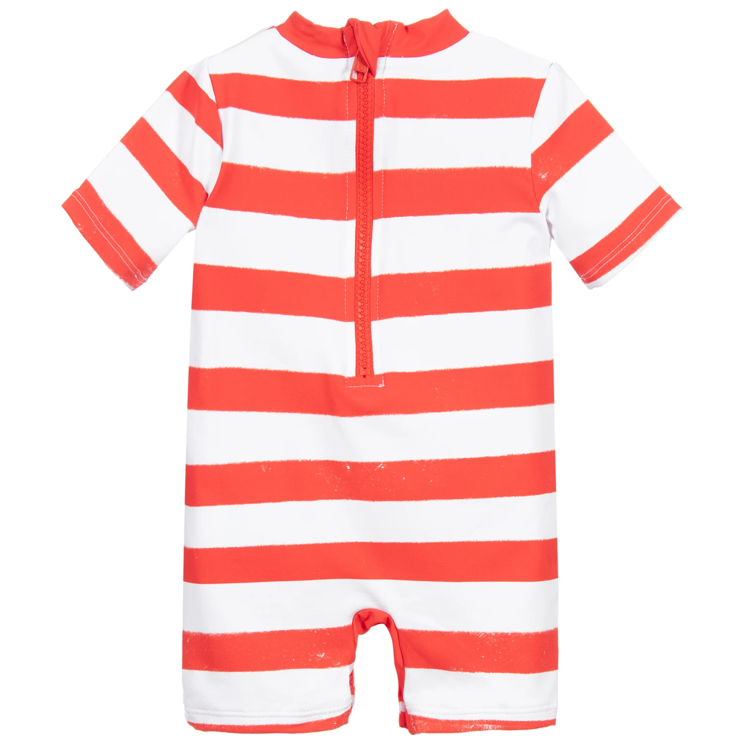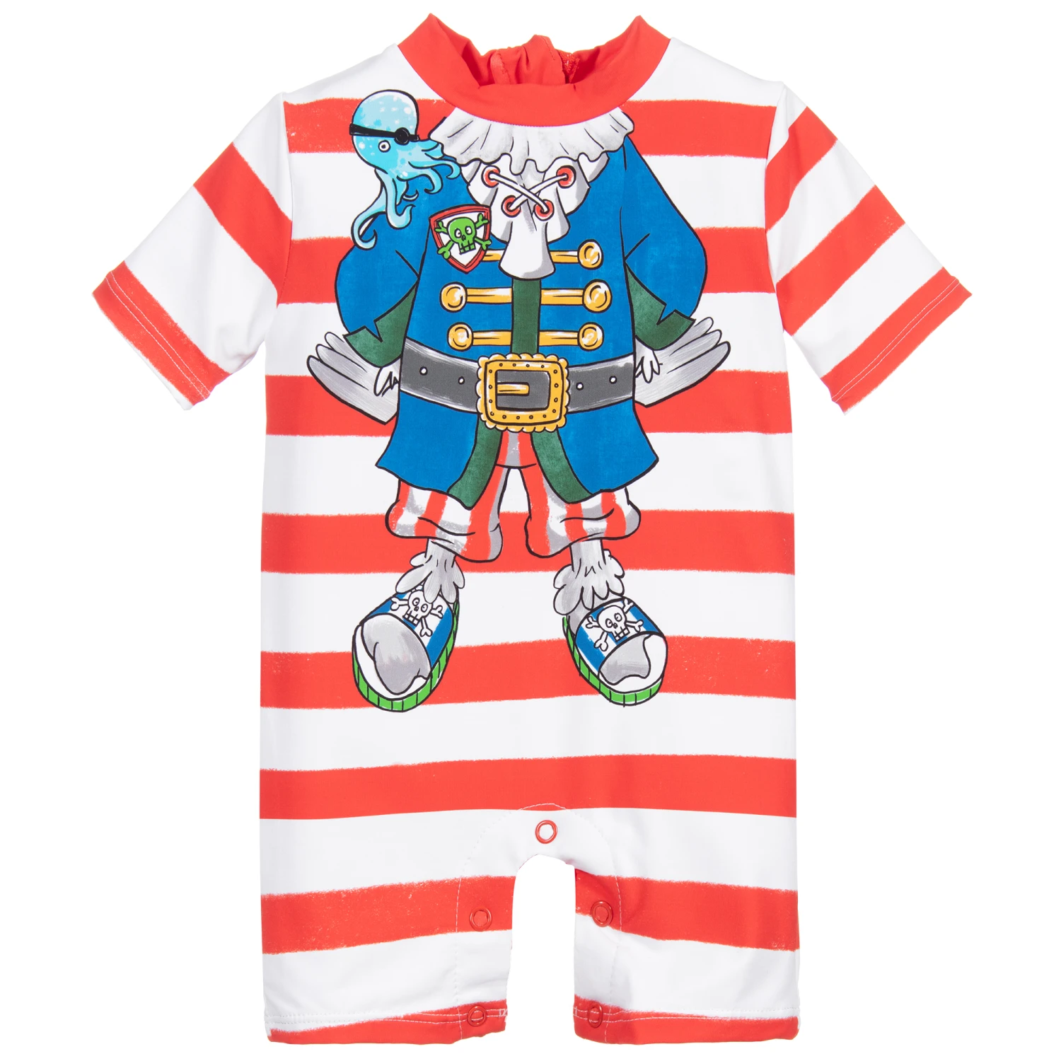 Fun swimsuit for younger boys by British designer Stella McCartney Kids, with a sun protection UPF 50+. Made in silky recycled nylon, it has red and white stripes and the body of a pirate printed on the front.