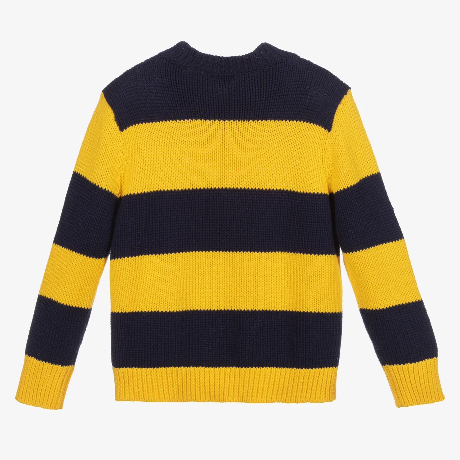Navy blue and yellow striped sweater for boys by Stella McCartney Kids. Knitted in a blend of soft wool and organic cotton, it has an ‘Eat My Dust’ bulldog appliqué on the front.