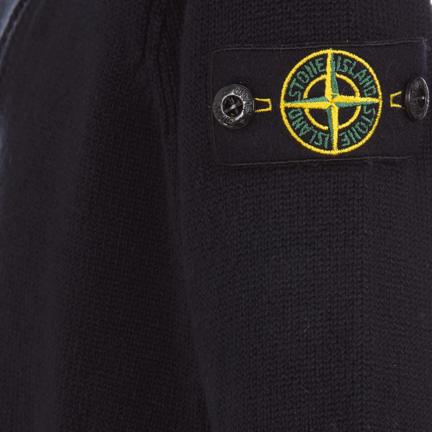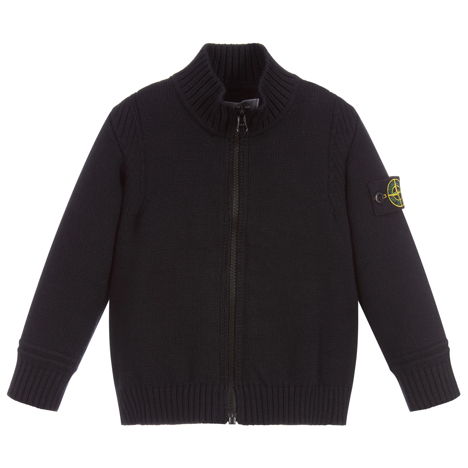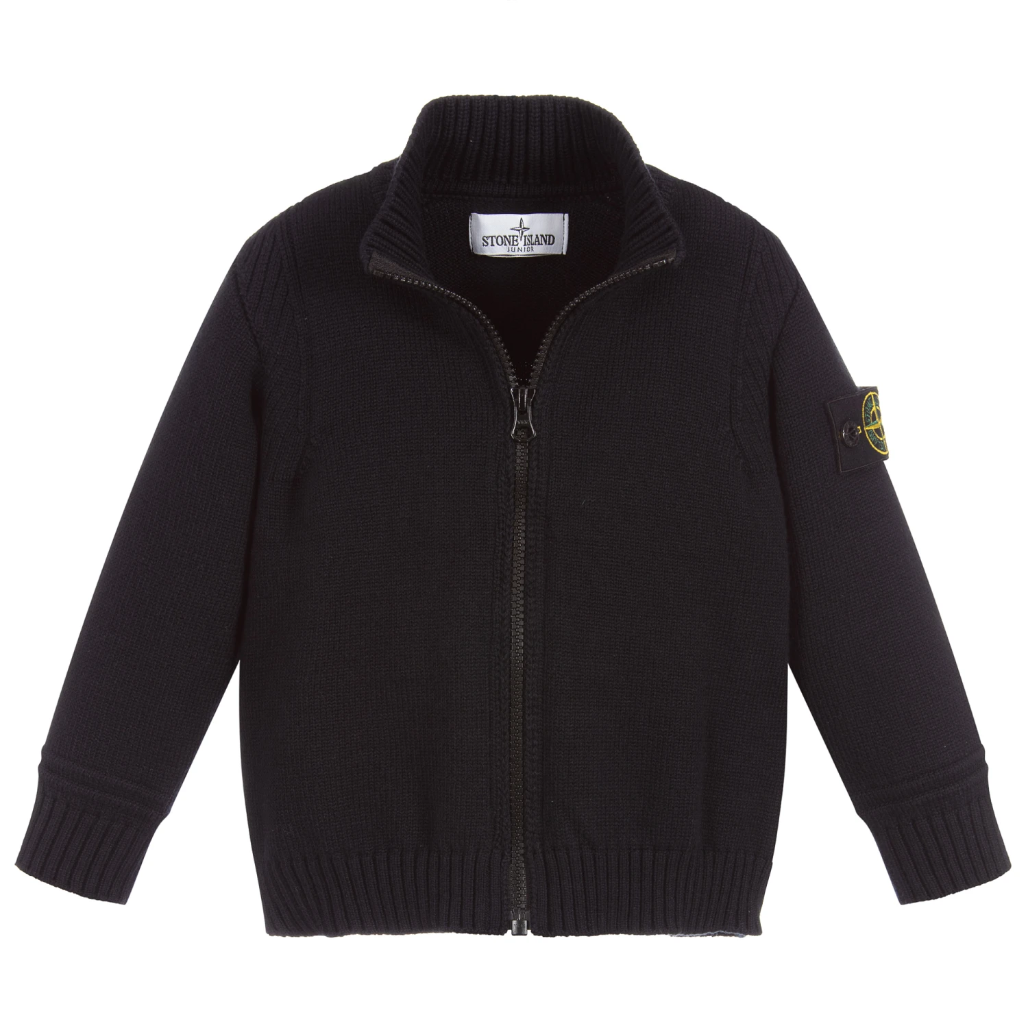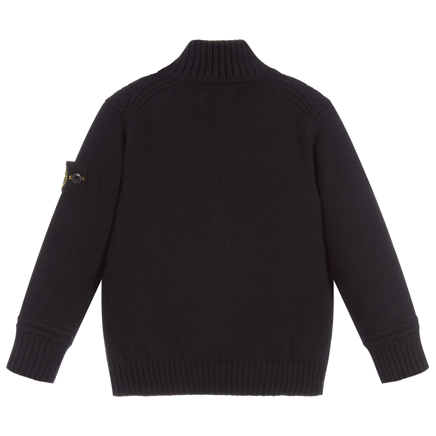 Boys navy blue zip-up top from Stone Island Junior, knitted in a soft lightweight cotton blend. It has a ribbed, turtle neck and the brand’s signature black compass logo badge buttoned onto one arm.