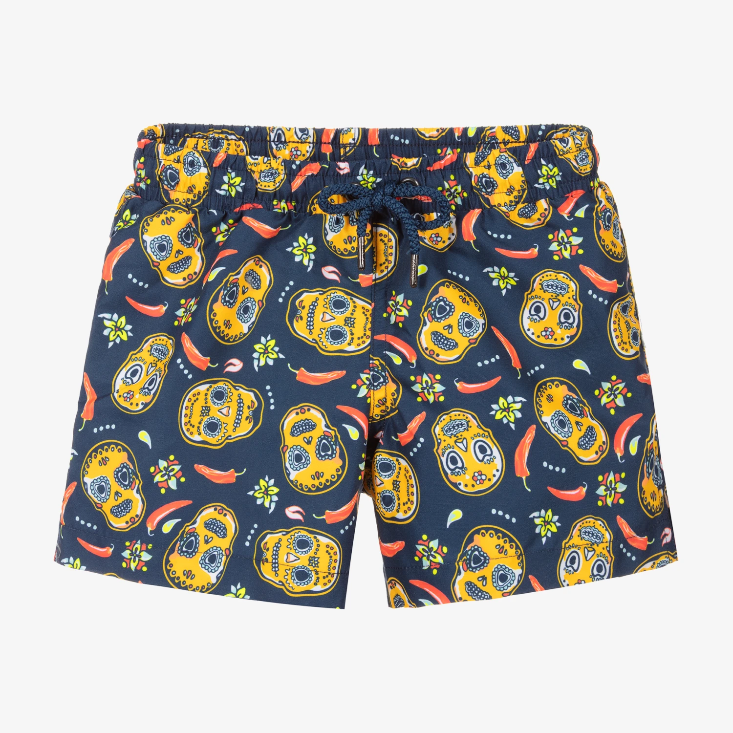 Boys navy blue swim shorts by Sunuva, with a fun yellow skull and red chilli pepper print. Made in soft, quick drying polyester, they have a soft mesh lining for comfort and a navy blue drawstring on the elasticated waistband. There is a useful velcro fastening pocket on the back.