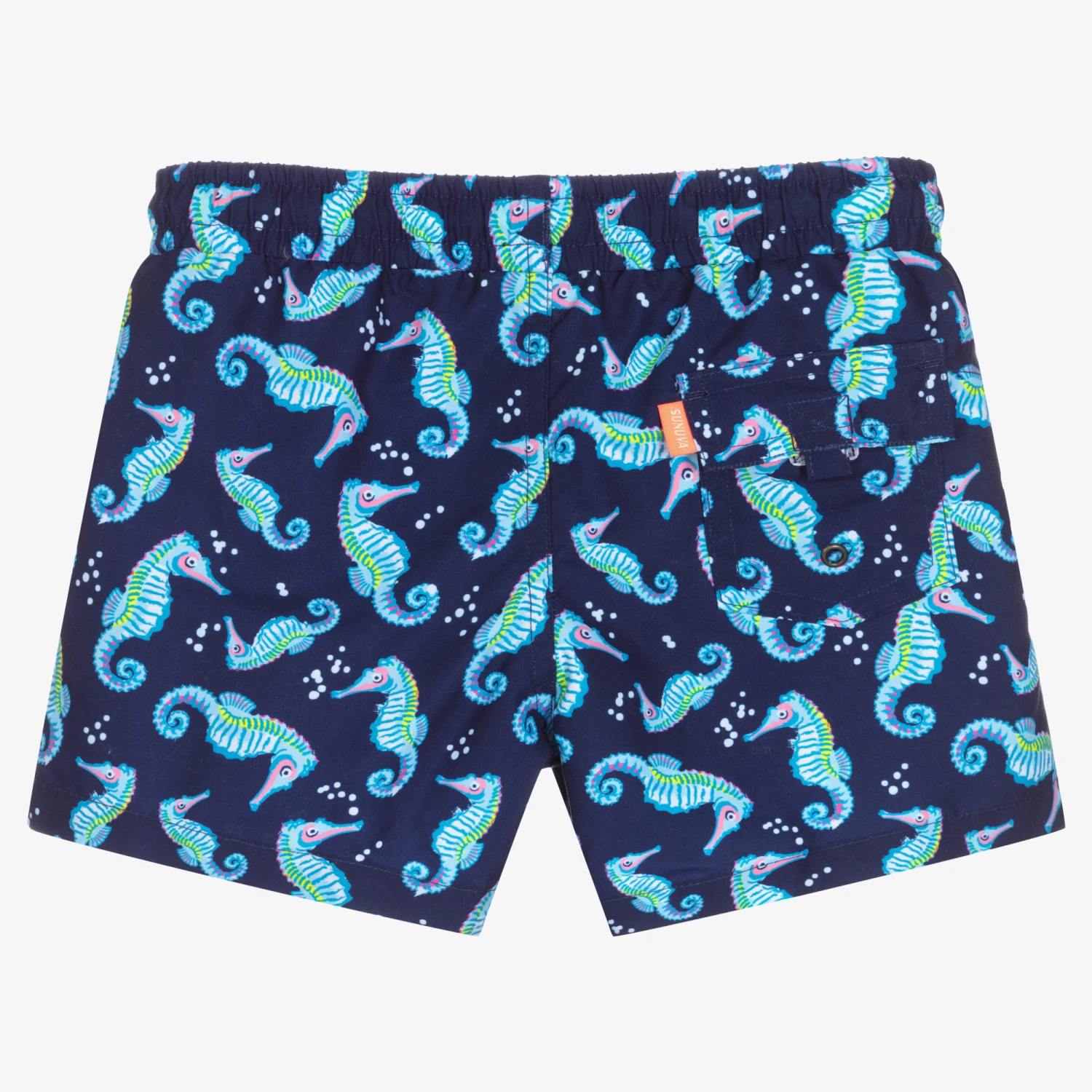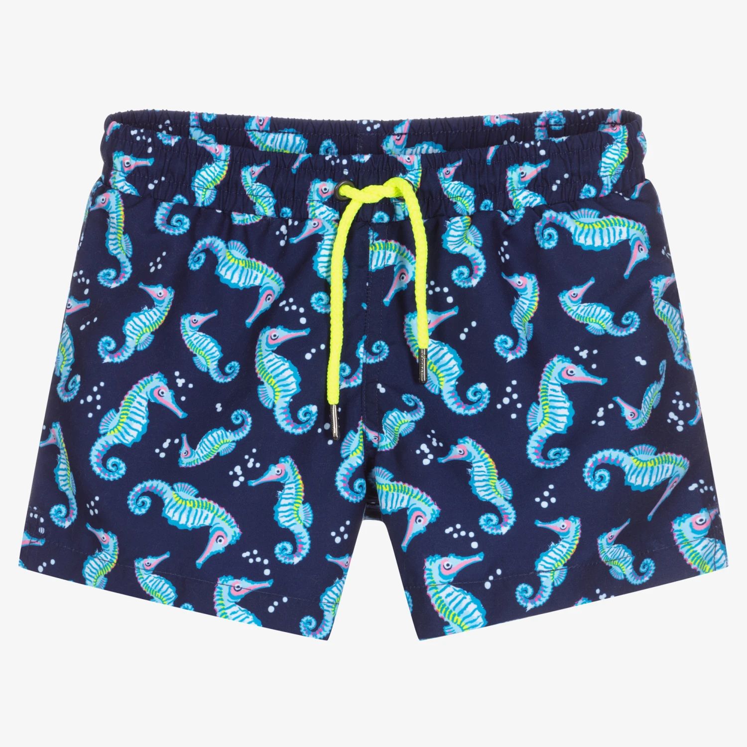 Fun navy blue swim shorts for boys by Sunuva, made in lightweight polyester. Lined in soft and lightweight mesh, it has a blue and pink seahorse print all-over, with a neon yellow drawstring.