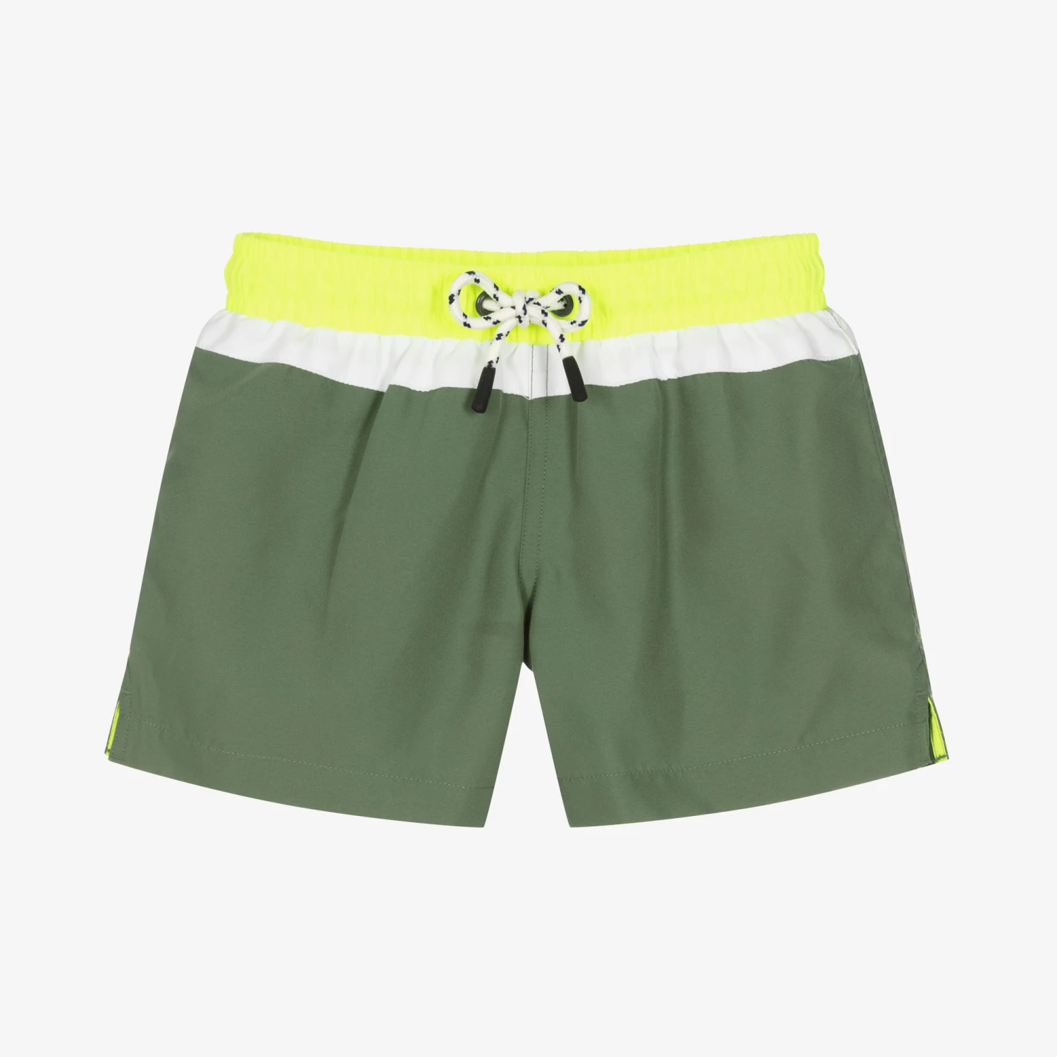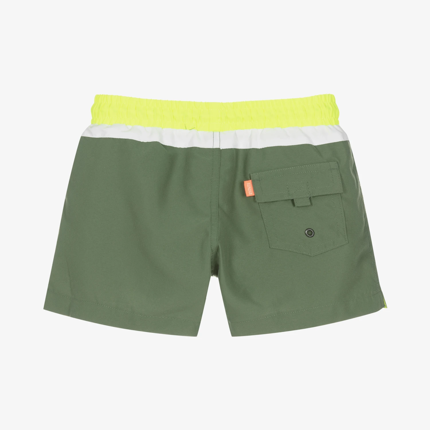 Cool in khaki green, these colour block look Mini-me swim shorts for boys are by Sunuva. They have a white trim, and an eye-catching neon yellow elasticated waistband with a black and white drawstring. Silky and lightweight, they are made from recycled fabric with a soft mesh lining for added comfort and a velcro fastening pocket with a neon pink logo tab on the back.