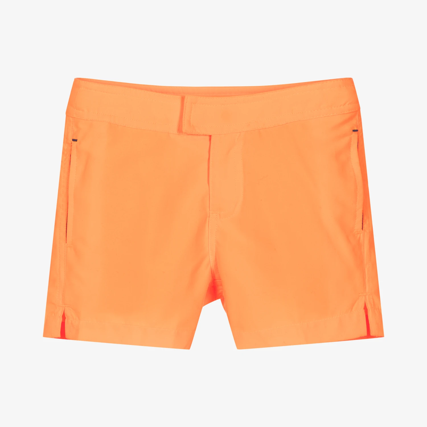 Bright neon orange swim shorts for boys by British brand Sunuva, made in soft and lightweight fabric with UPF 50+. With a peach finish, these comfortable shorts have a soft mesh brief lining and an adjustable waistband for a suitable fit. They fasten with a zip, popper and velcro closure and they have practical pockets on the front and back.