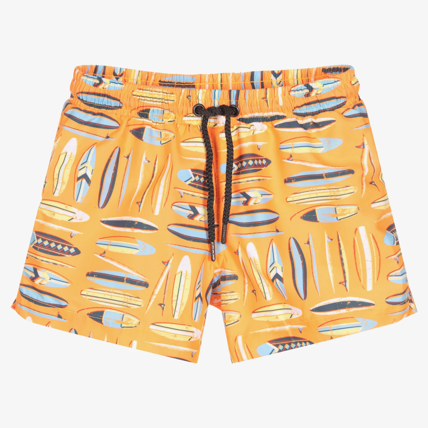 Bright orange swim shorts for boys by Sunuva, made in lightweight polyester. Lined in soft and lightweight mesh, it has a blue and yellow surfboard print all-over, and a grey drawstring.
