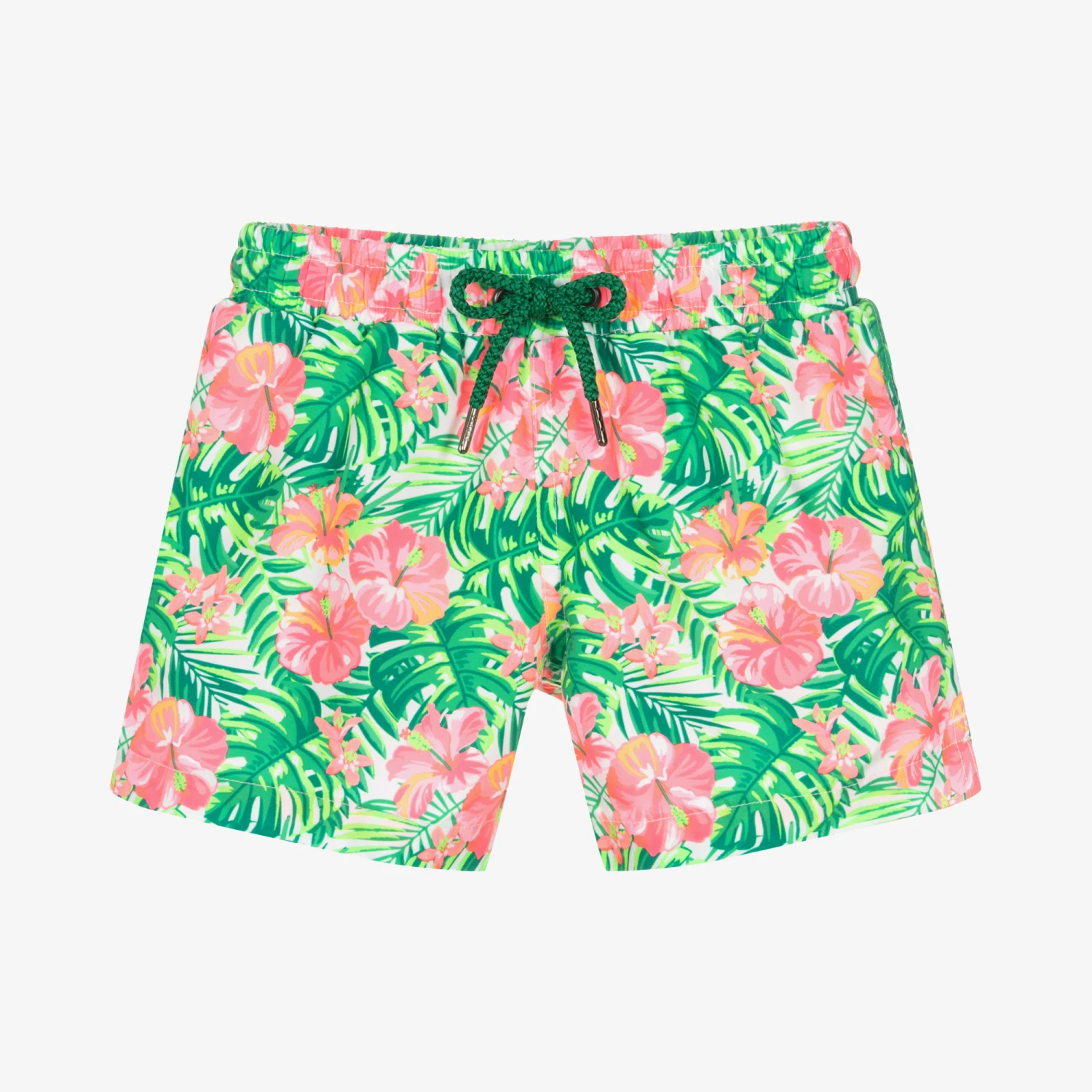 Cool, Mini-me swim shorts for boys by Sunuva, in a green jungle leaf and bright pink floral print. In a fun and vibrant tropical vibe, they feature an elasticated waist with an adjustable green drawstring and a velcro fastening pocket on the back. Silky and lightweight, they are made from recycled fabric with a soft and fine mesh lining for added comfort.