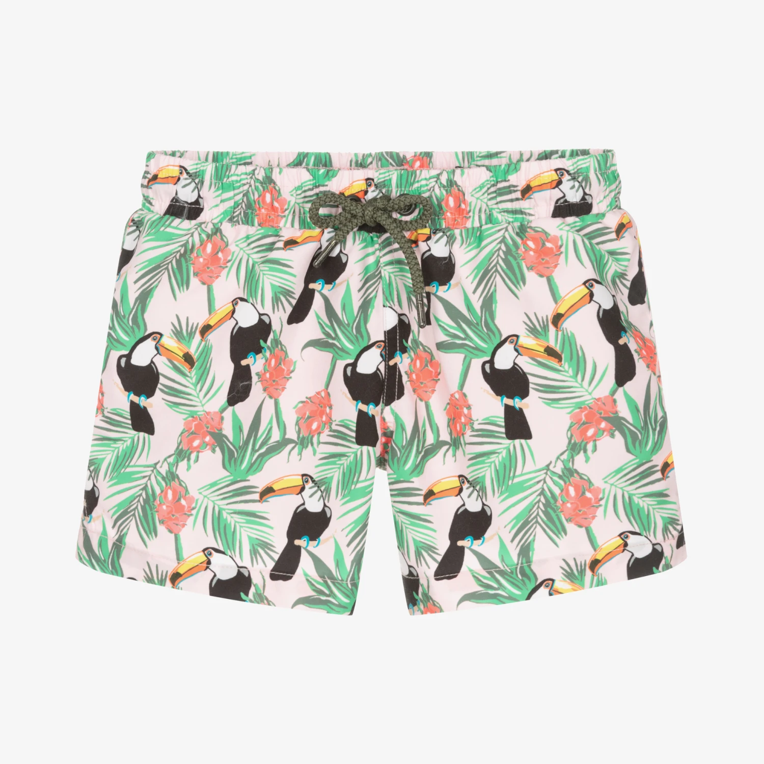 Boys pale pink Mini-me swim shorts by Sunuva, patterned with colourful toucan and tropical fruit motifs. This fun style has an elasticated waist with an adjustable khaki green drawstring and a velcro fastening pocket with an eyelet feature on the back. Silky and lightweight, they are made in recycled fabric with a soft and fine mesh lining for added comfort.
