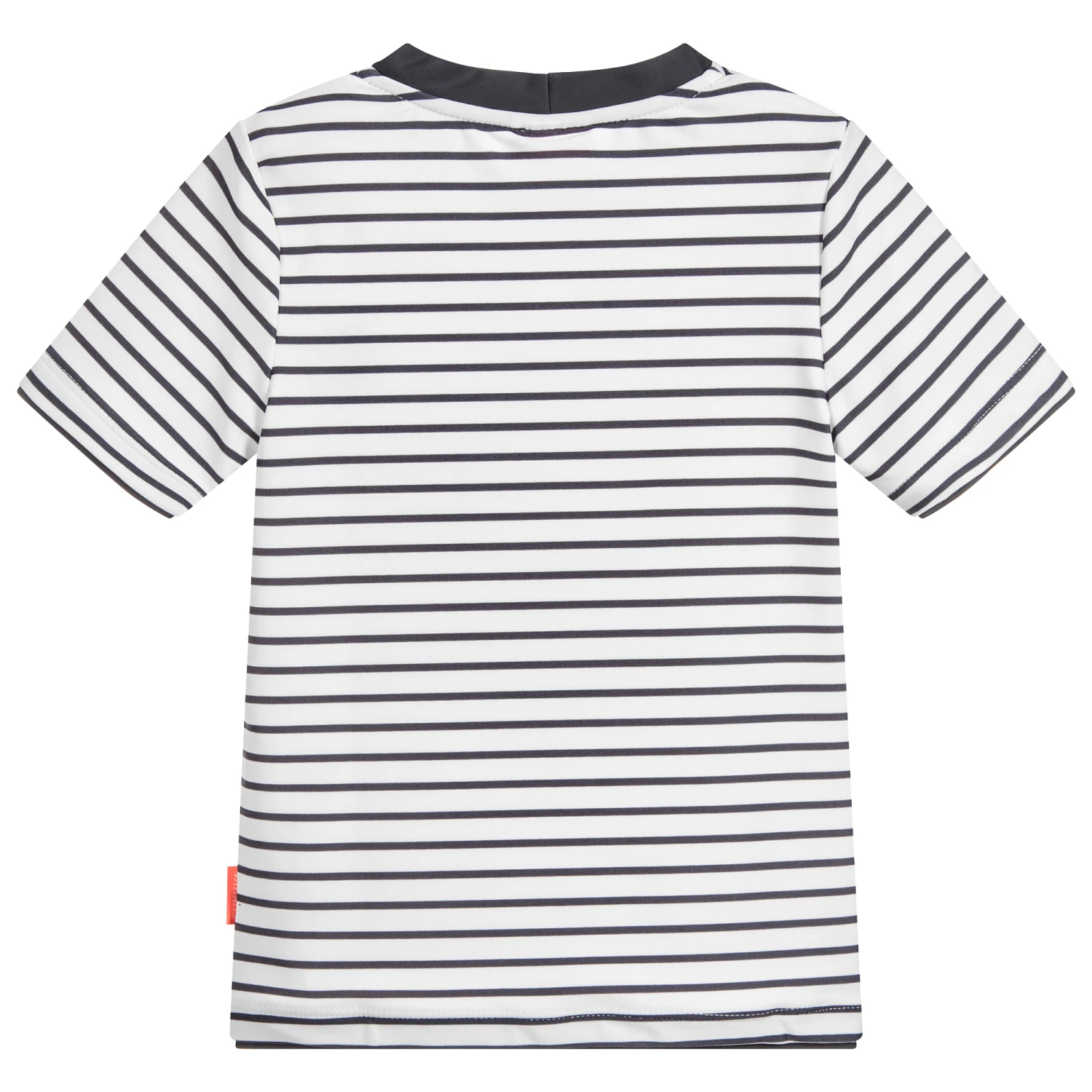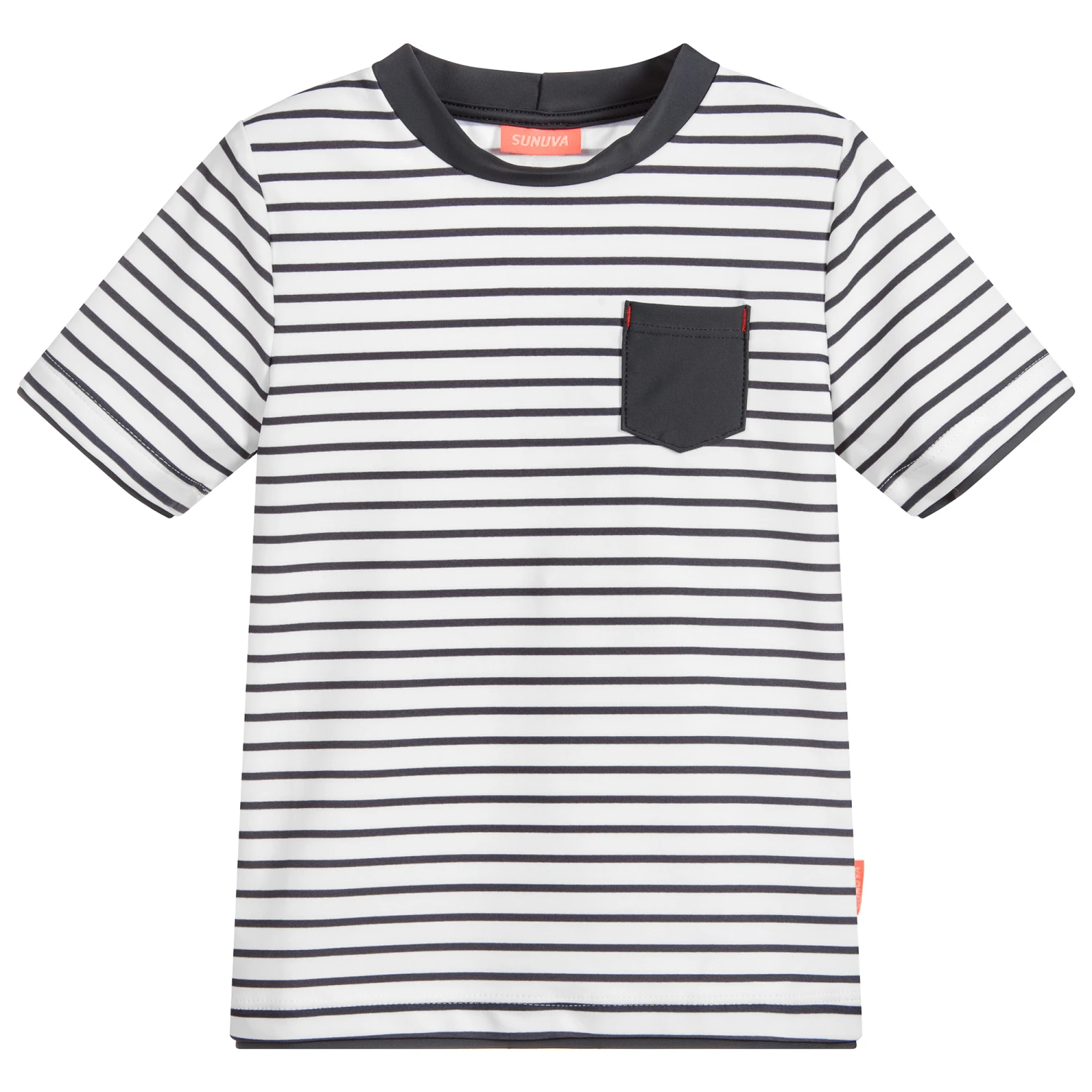 Ivory and grey striped top for boys by Sunuva, made in stretchy polyester with UPF 50+ protection.