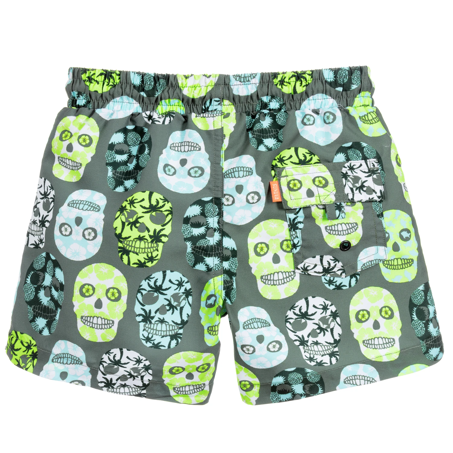 Khaki green swim shorts for boys by Sunuva, with UPF50+ sun protection. Patterned with skulls in neon yellow, blue and green, they have a soft mesh lining and an elasticated drawstring waist.
