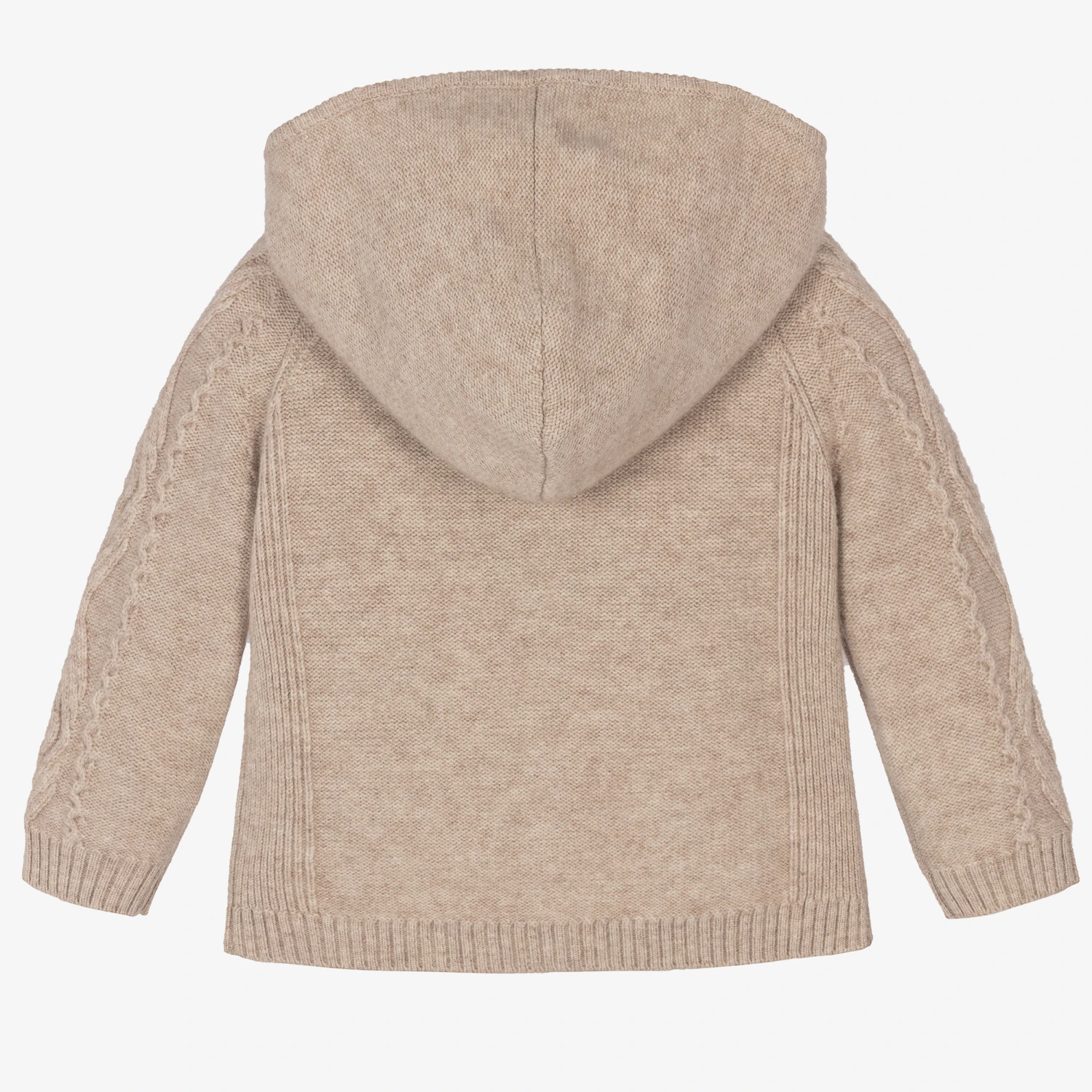 Beige wool blend zip-up hooded top for little boys by Tartine et Chocolat. Soft and mid-weight, this cable knit top has a small brown logo tab above the hem.