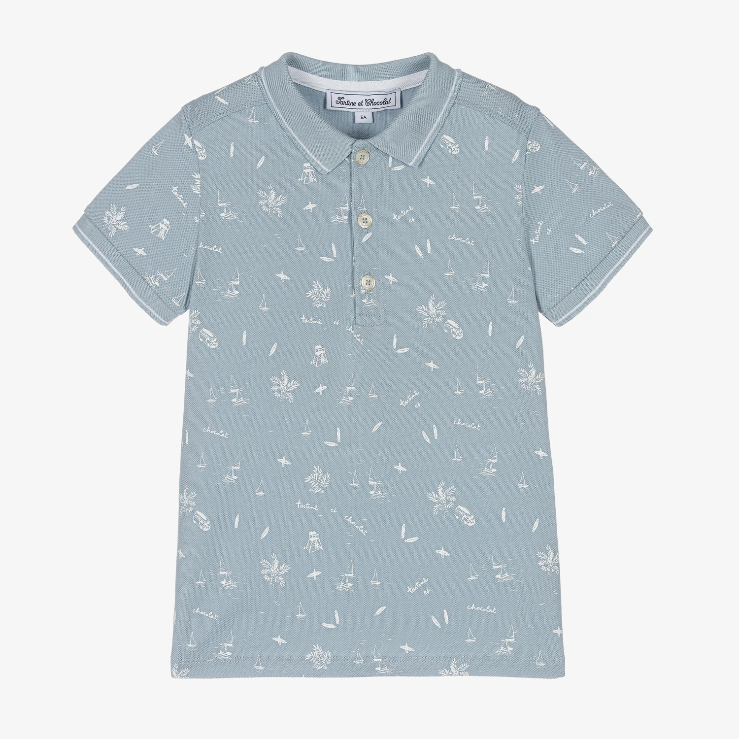 Light blue polo shirt for boys by Tartine et Chocolat, made in soft and stretchy cotton piqué. Cool and comfortable, it has a white all-over beach-themed design, with boats, camper vans and surfboards interspersed with logos. There are white striped trims on the ribbed collar and cuffs and logo-branded button fastenings on the front.