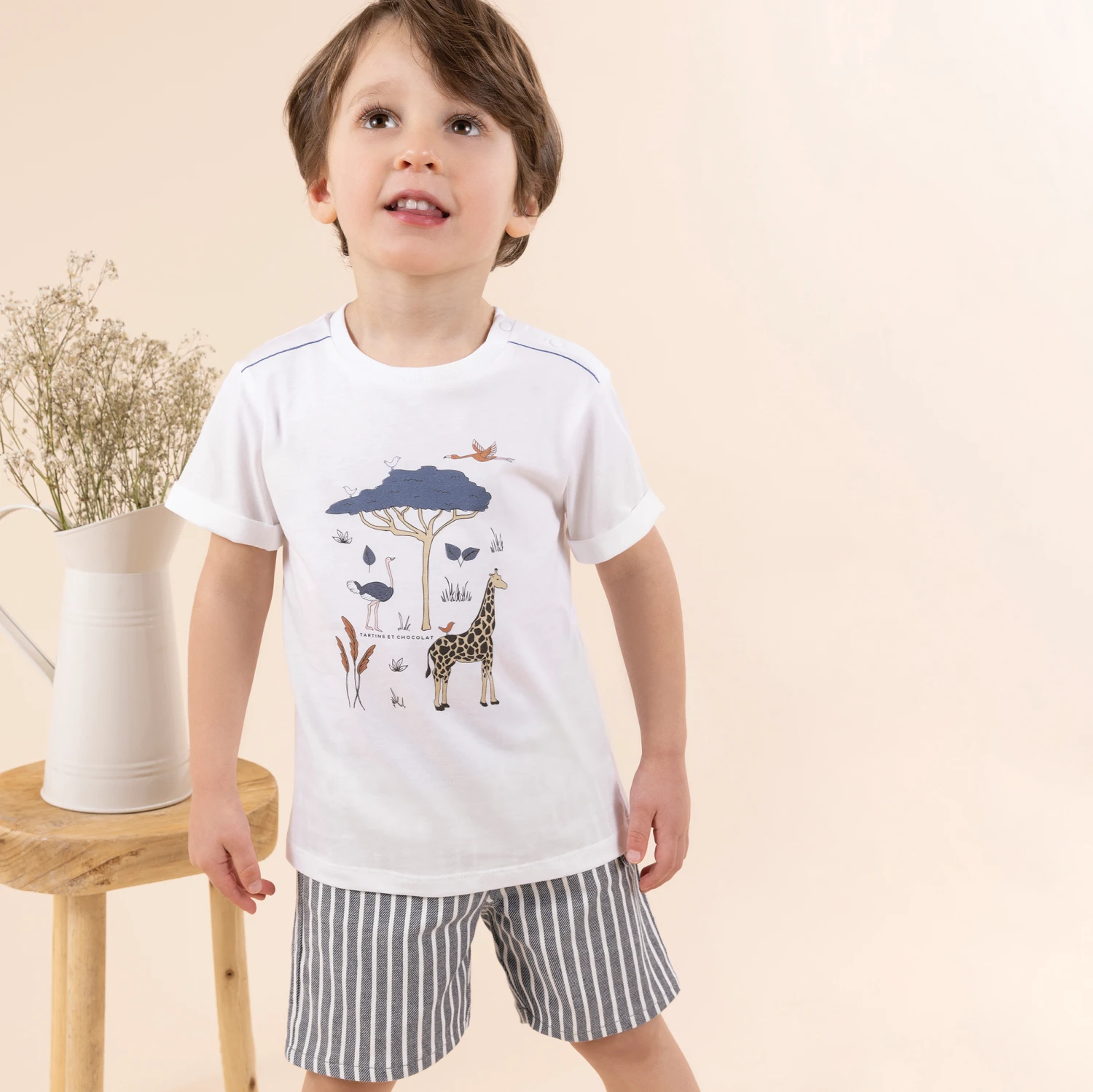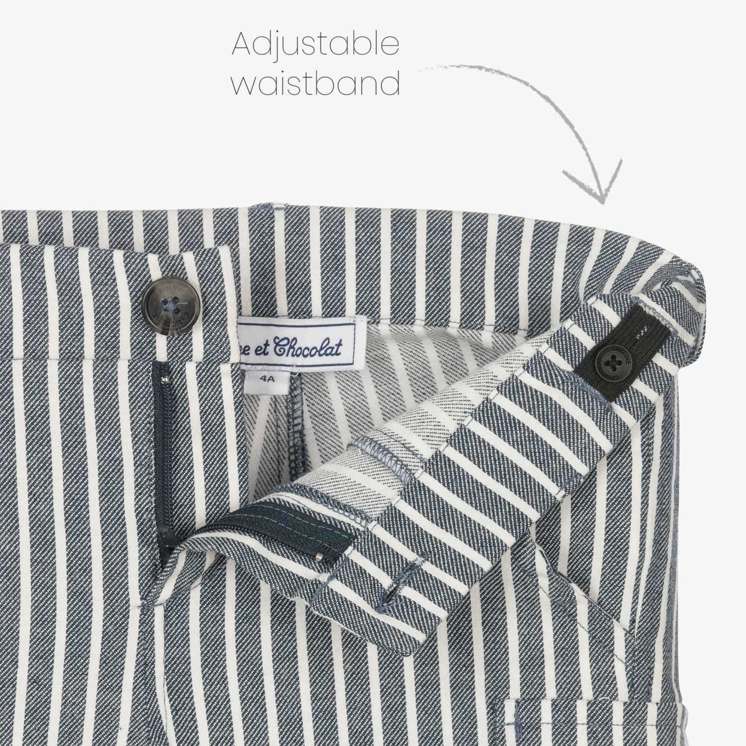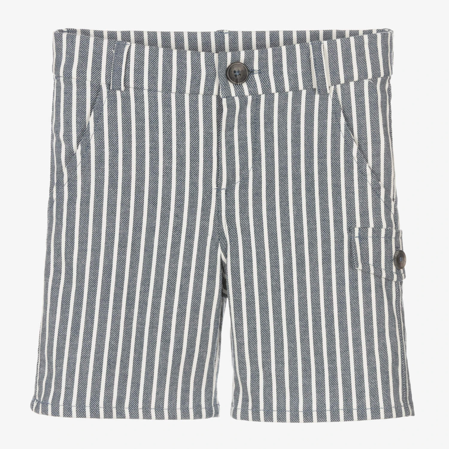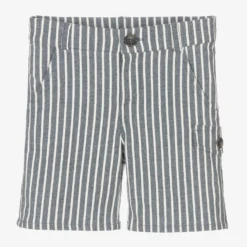Blue and white striped shorts for boys by Tartine et Chocolat, made in a soft cotton blend twill. They have slanted front pockets and a fixed pocket flap on one leg. Casual but stylish, they have a button and zip fastening and a useful adjustable waist.