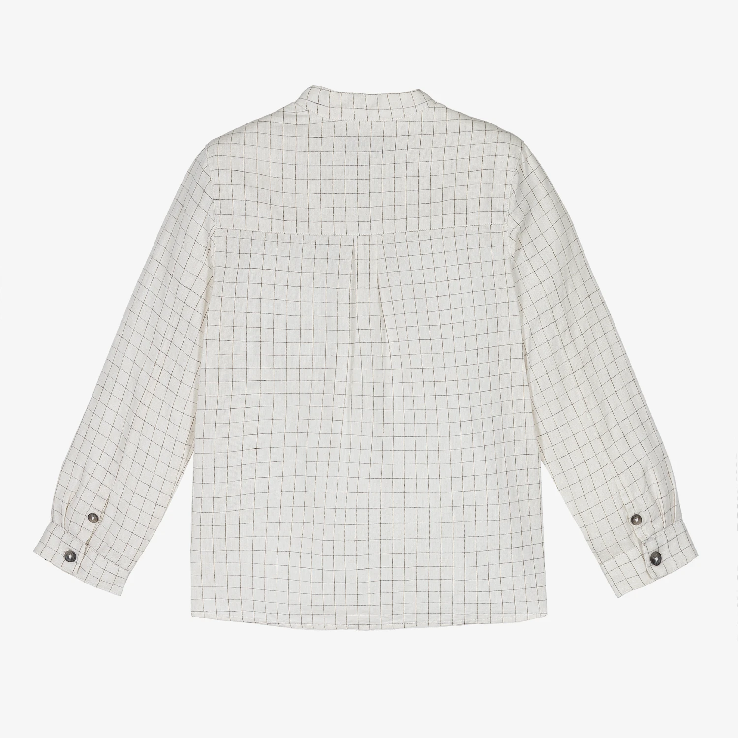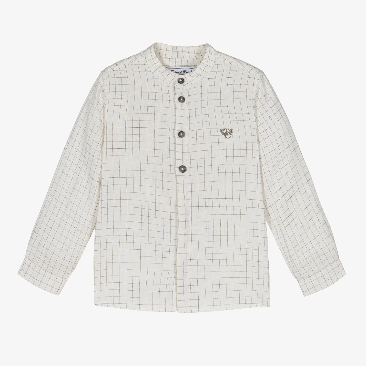 Smart ivory shirt for boys by Tartine et Chocolat. Soft and lightweight, it has a brown check pattern and an embroidered logo on the chest. Cool and comfortable, this stylish collarless shirt has button fastenings on the front.
