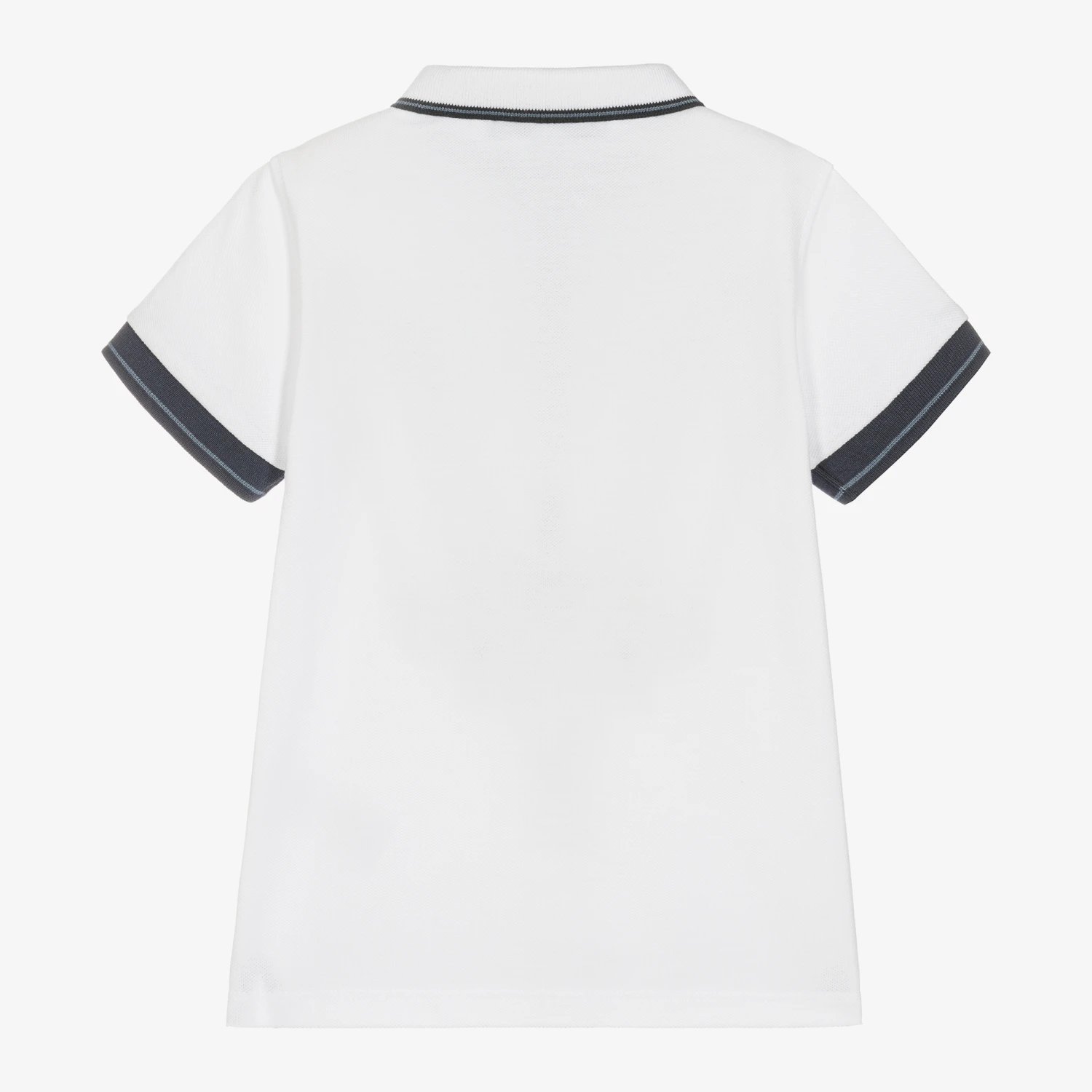 White polo shirt for boys by Tartine et Chocolat, made in soft and stretchy cotton piqué. Cool and comfortable, it has a blue and white rubberised logo patch on the chest, with an African safari-themed design. There are blue striped trims on the ribbed cuffs and collar and blue trims on the split hem and button placket.