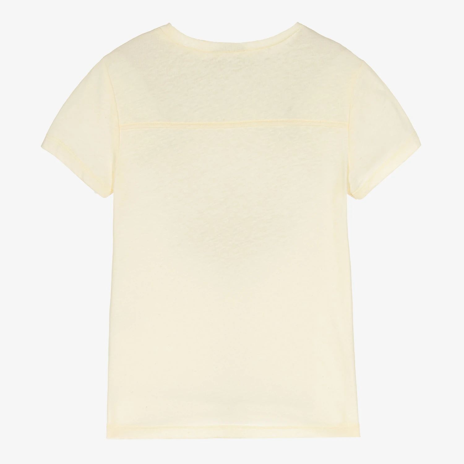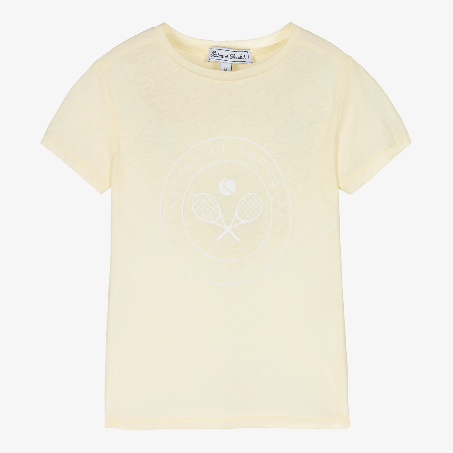 Pale yellow T-shirt for boys by Tartine et Chocolat, made in a soft, lightweight blend of cotton and linen jersey. There is a white logo motif on the front, with a sporty tennis-themed print. Smaller sizes have useful popper fastenings on one shoulder.
