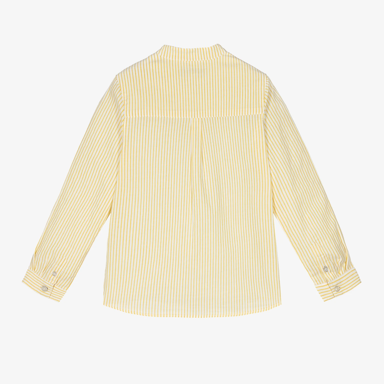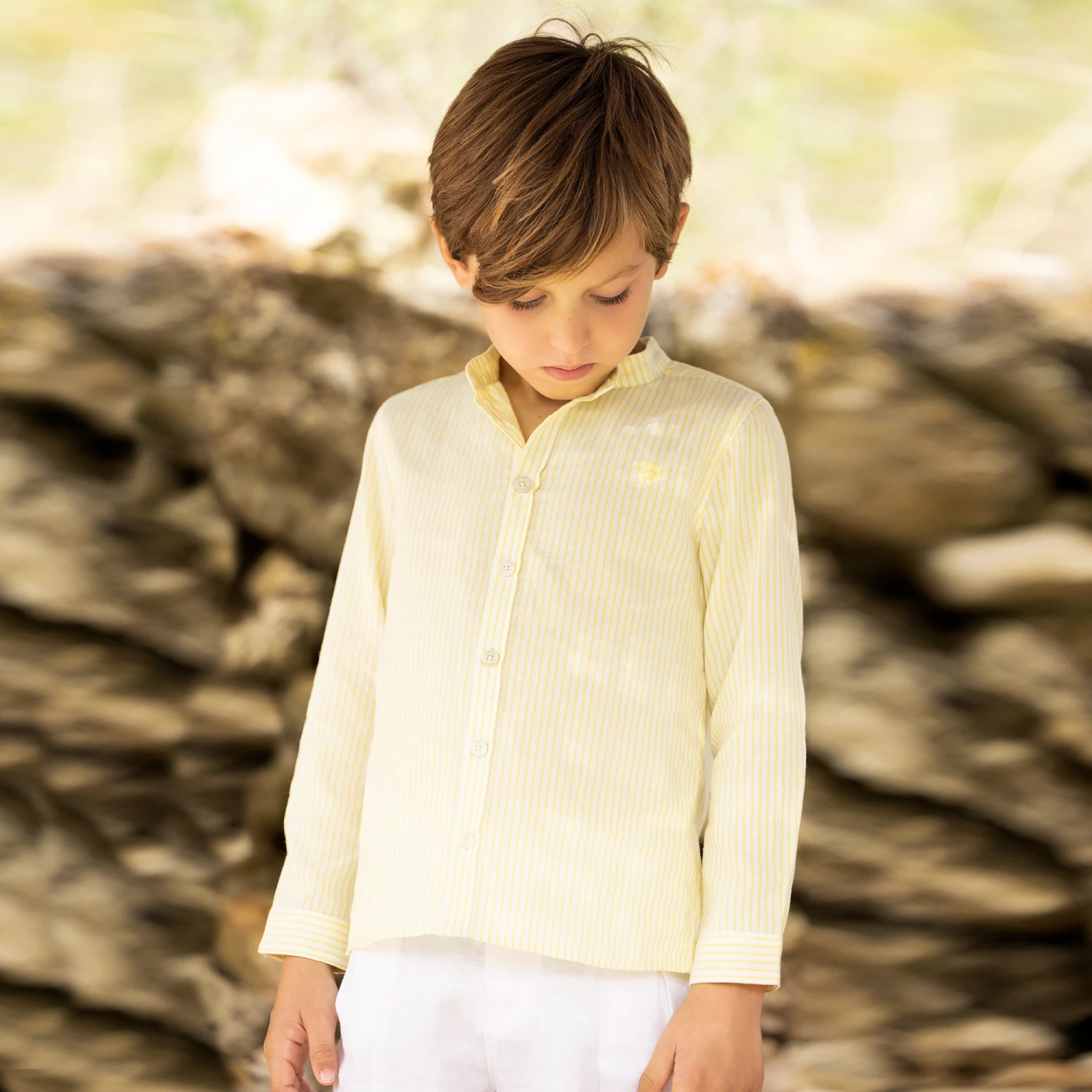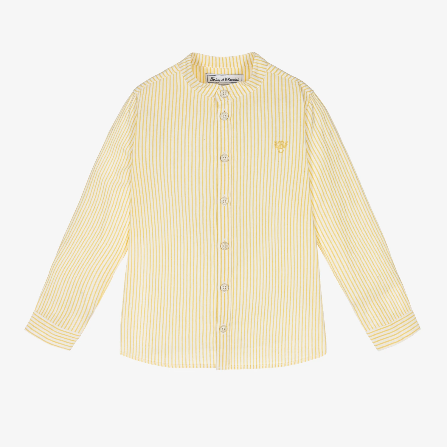 Yellow and white striped shirt for boys by Tartine et Chocolat, made in lightweight cotton. Cool and comfortable, it has a yellow embroidered logo on the chest. This stylish collarless shirt has button fastenings on the front.
