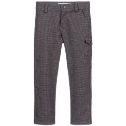 Boys grey, red and navy blue checked trousers from Tartine et Chocolat. Made in a brushed viscose blend, they have a useful adjustable waistband with belt loops. The faux back pocket has the brand’s logo embroidered in orange.