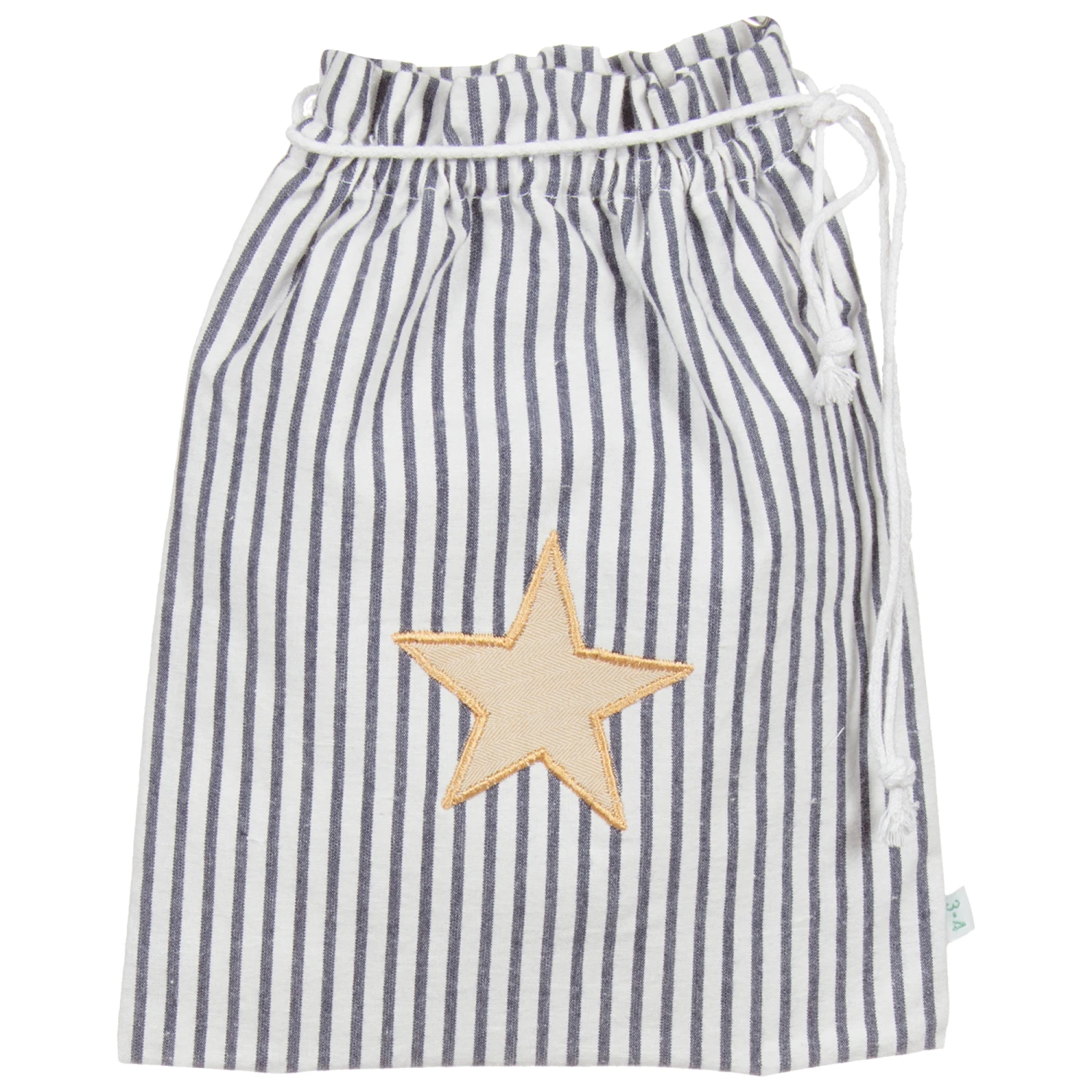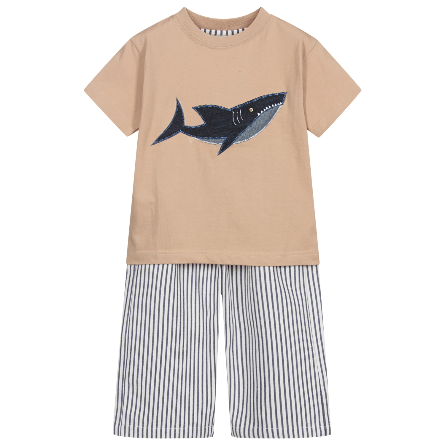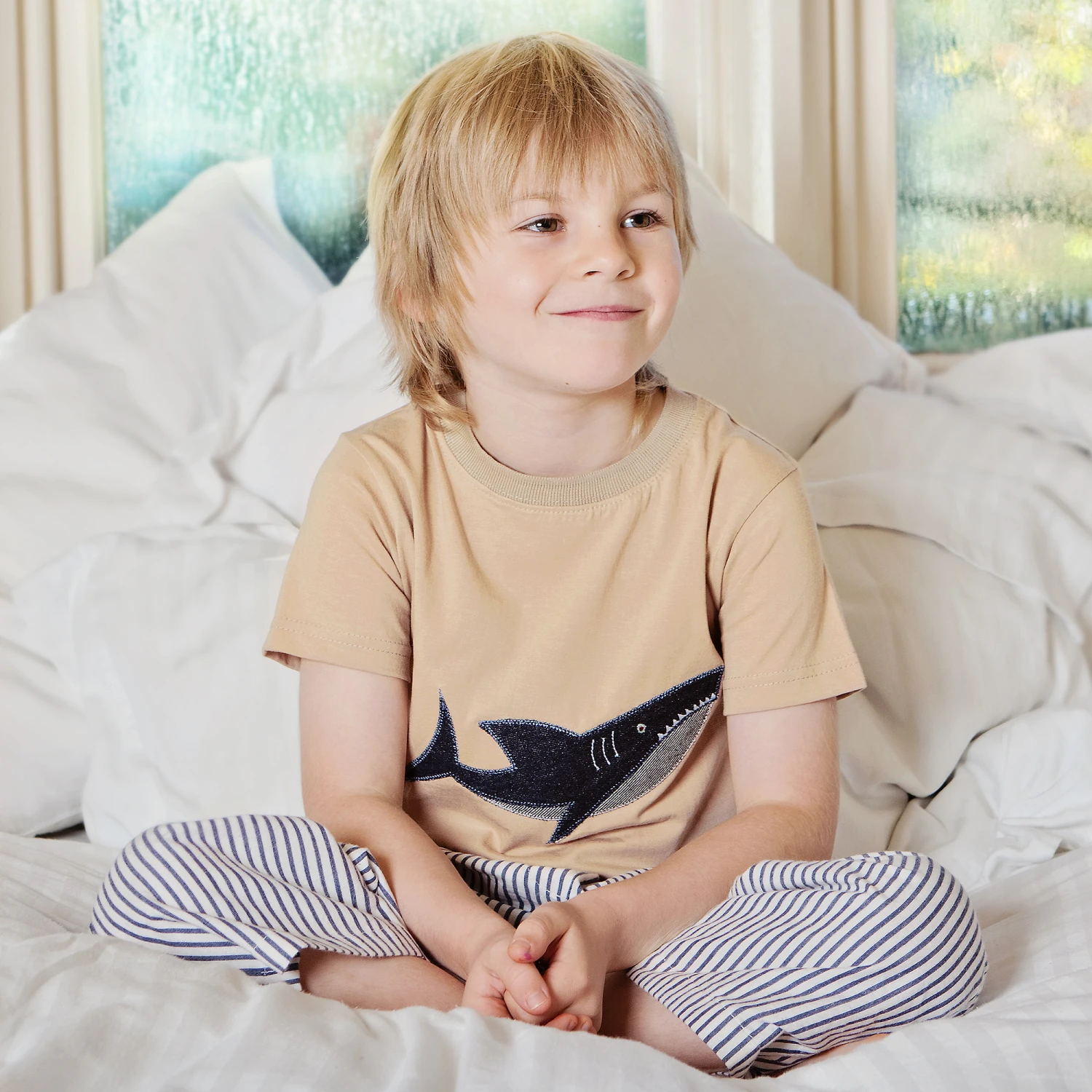 Beige and blue pyjamas for boys by Turquaz. The beige cotton jersey T-shirt has an embroidered shark appliqué on the front. The cotton trousers are striped in ivory and navy blue and come with a matching storage bag.