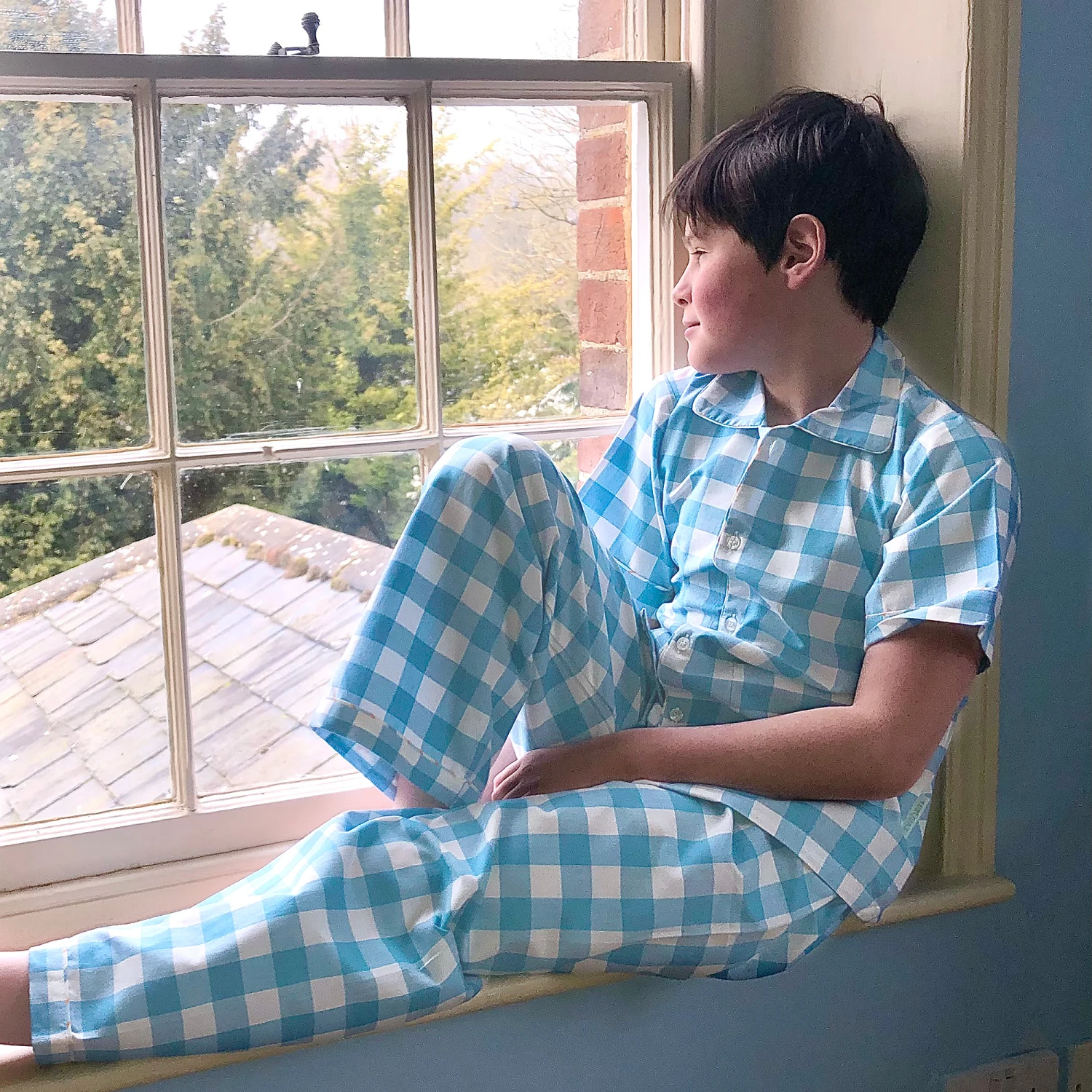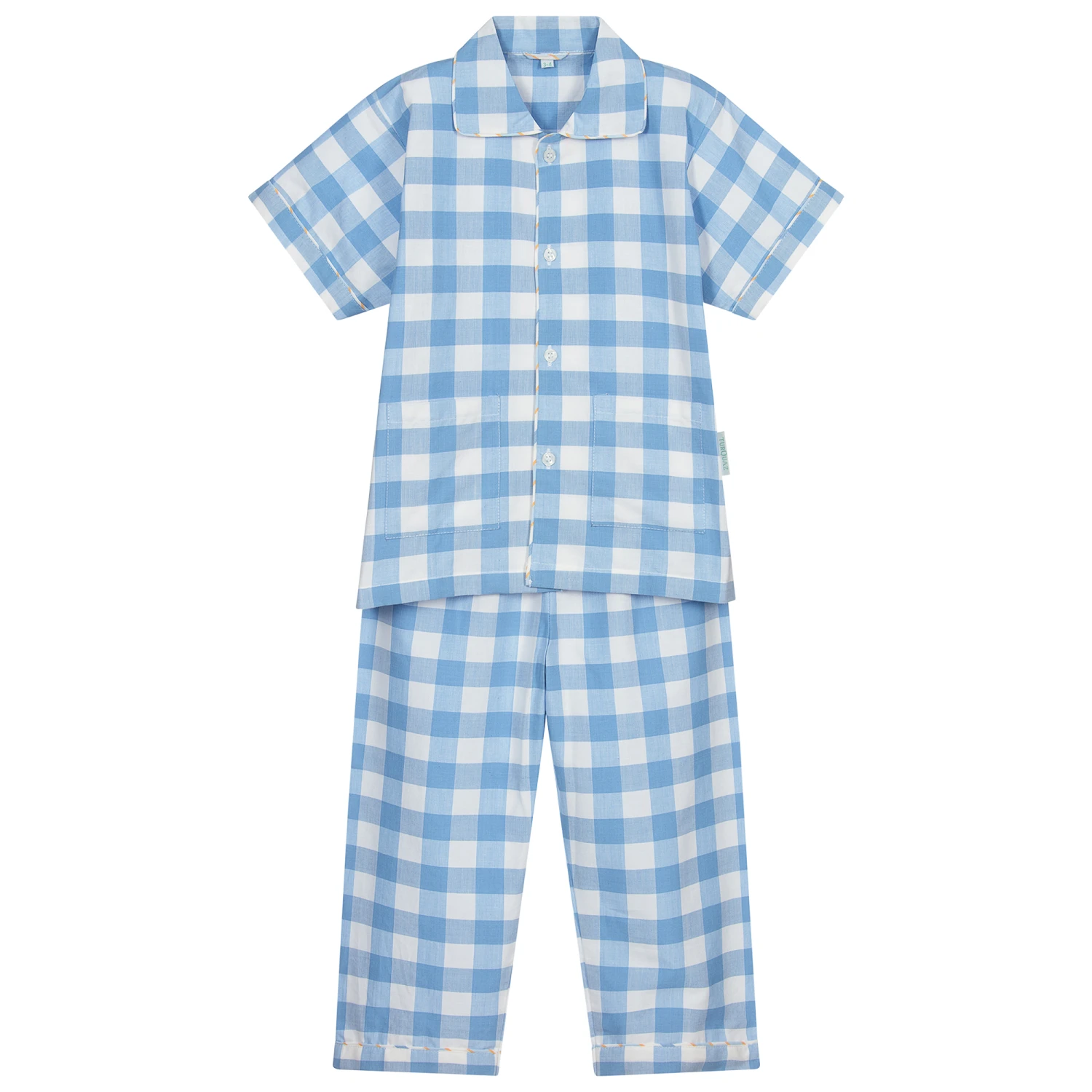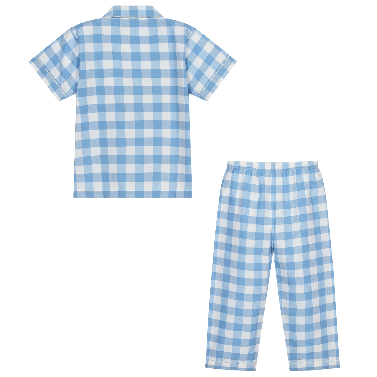 Blue and white checked pyjamas for boys by Turquaz, made in soft lightweight cotton. The top fastens with buttons and the trousers have a comfortable elasticated waist.