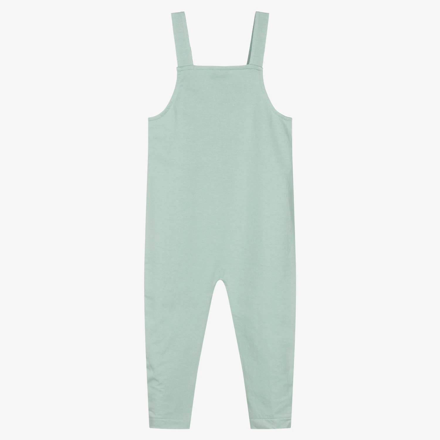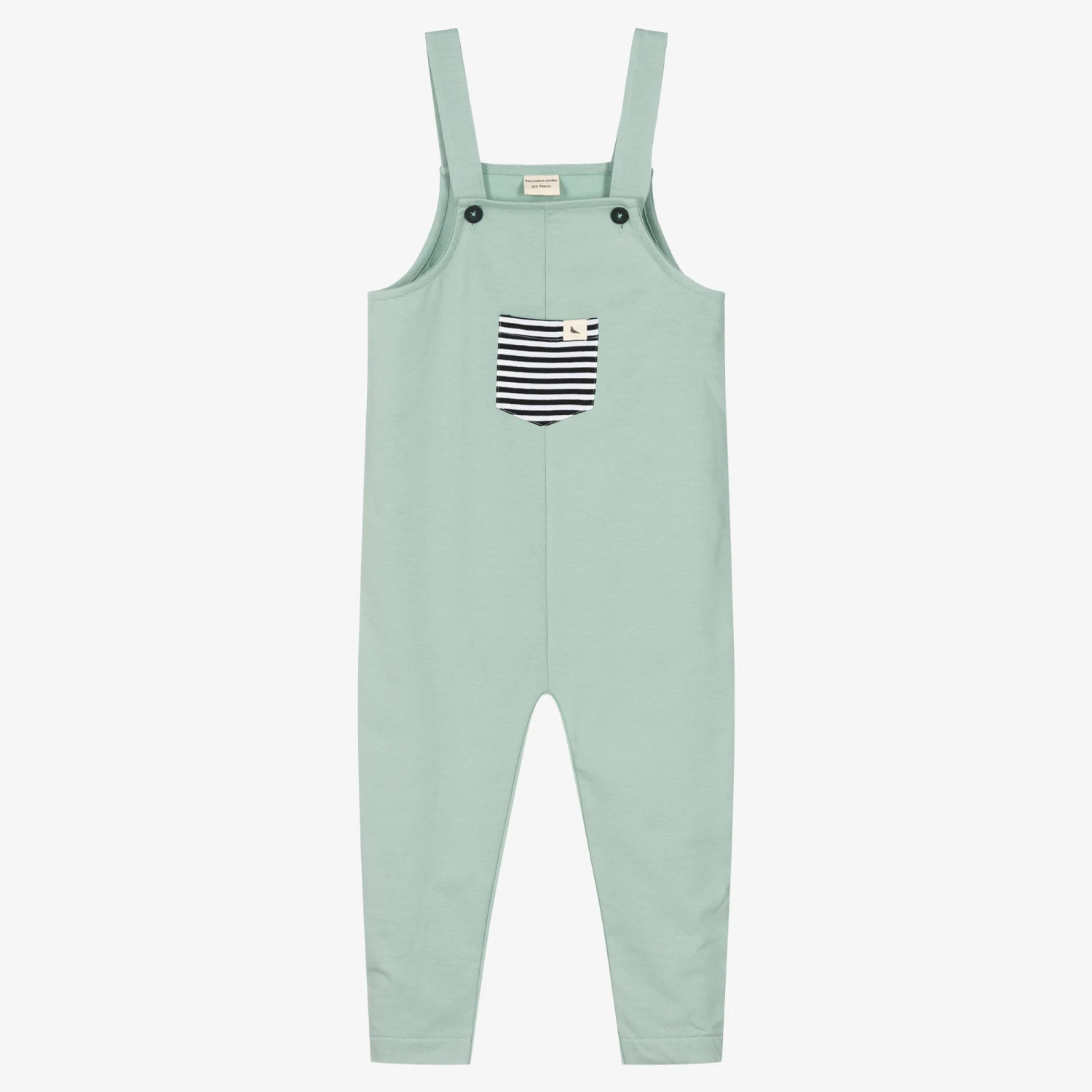 Light blue dungarees for boys and girls by Turtledove London, made from the softest organic cotton jersey. Great for casual layering, these relaxed dungarees have adjustable button fastening shoulder straps. A stripy black and white pocket is featured on the front, finished with a canvas logo.