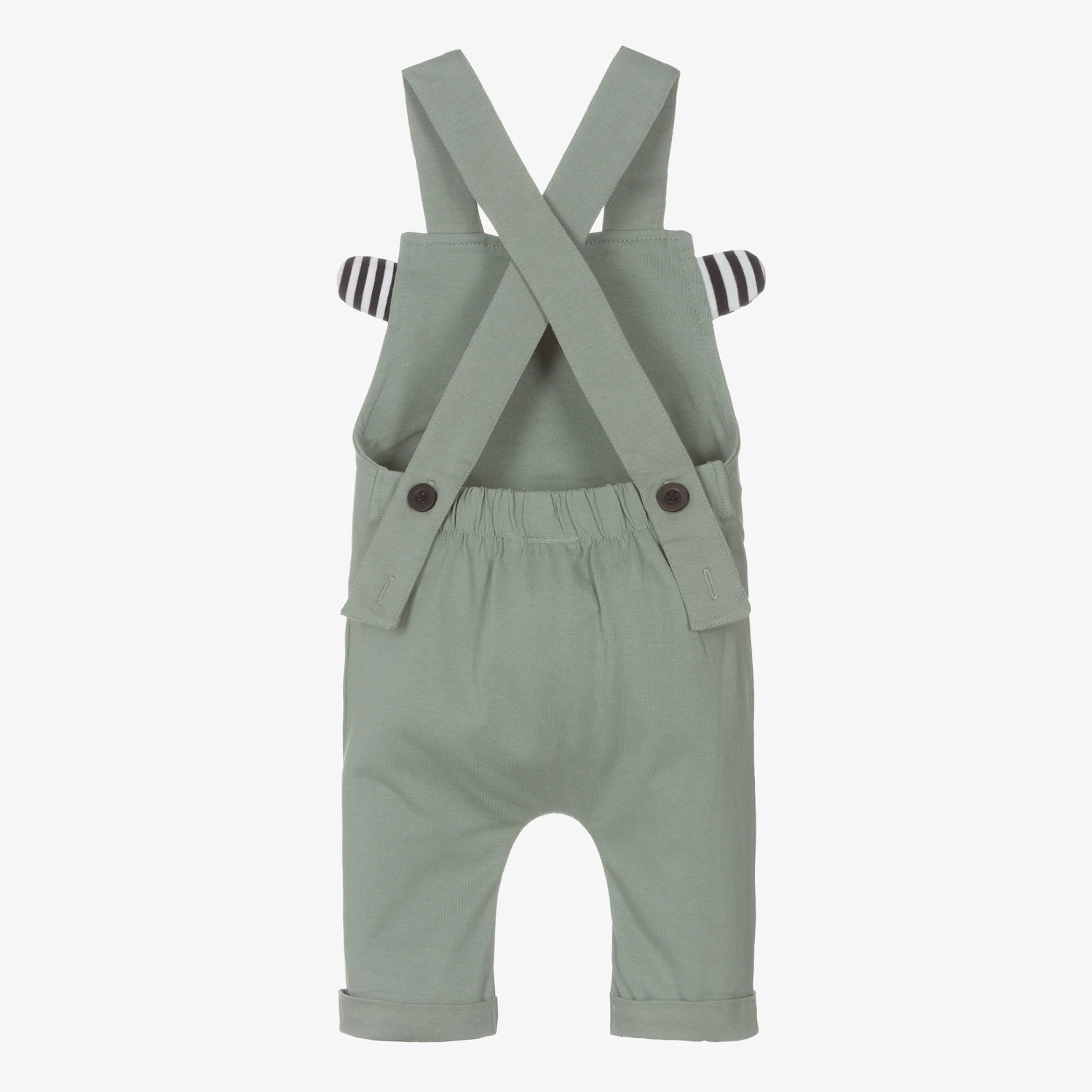 Sage green dungarees for boys and girls by Turtledove London, made in soft organic cotton jersey. Sweet and sustainable, they have a bear face print, with striped ears appliquéd on the front and casual turn-up ankles. They have an elasticated waist and adjustable shoulder straps with button fastenings.