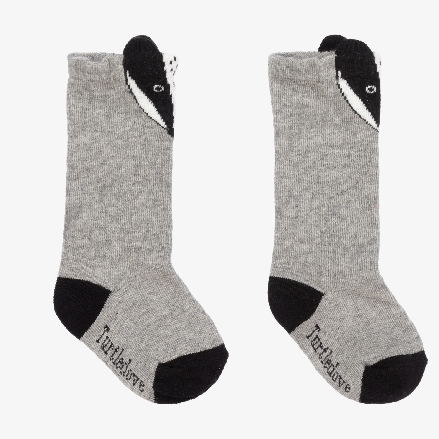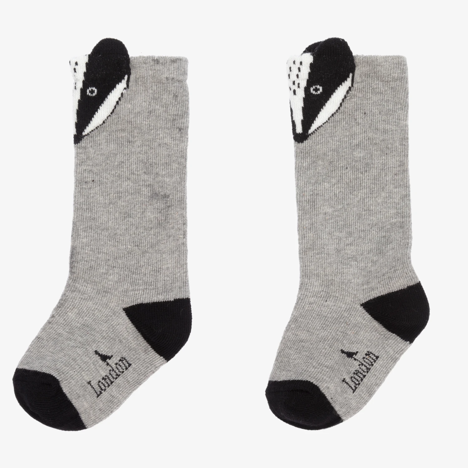 Softly knitted socks for boys and girls from Turtledove London, in grey and black. Made in a cotton blend, these knee-length socks have a friendly badger design with 3D ears on the back.