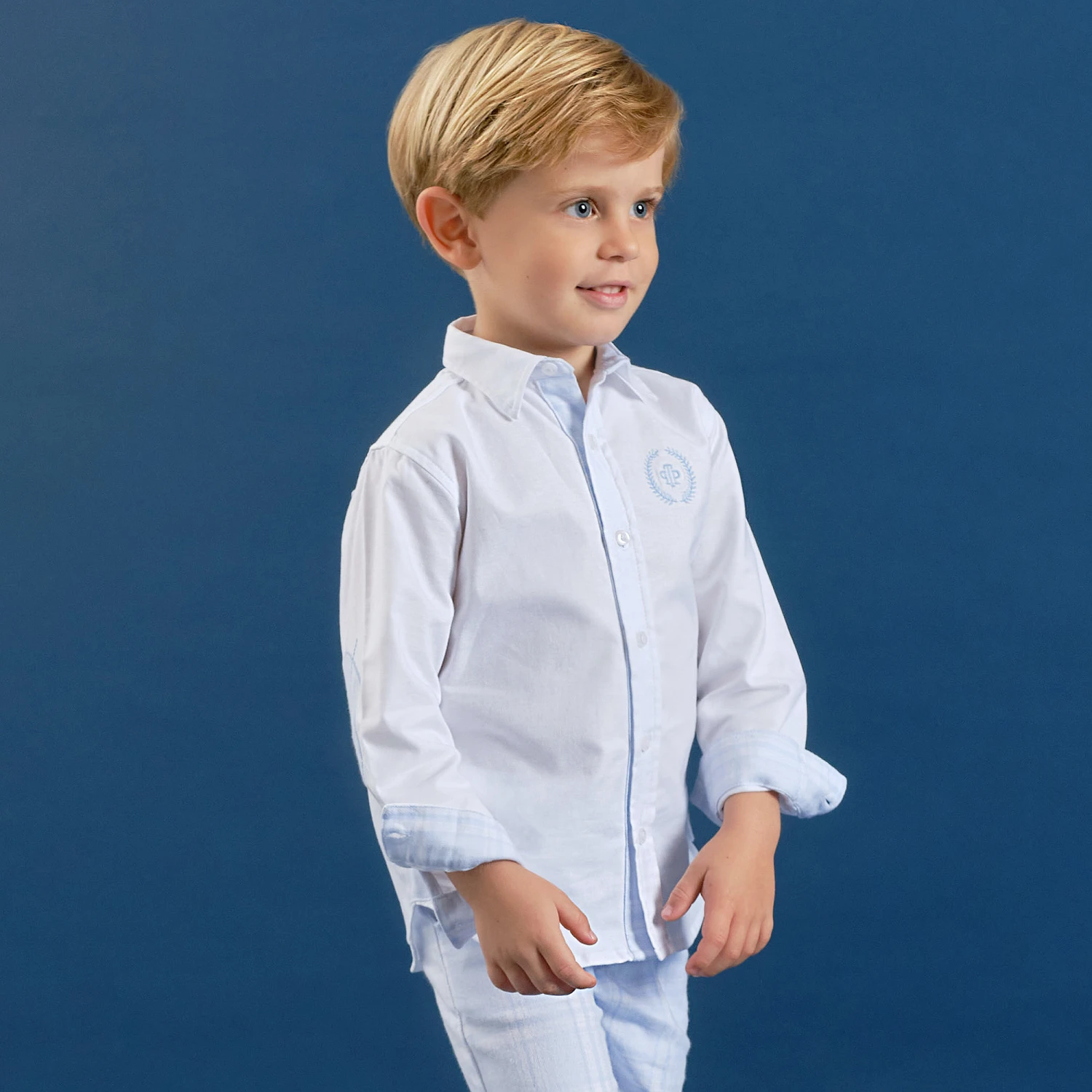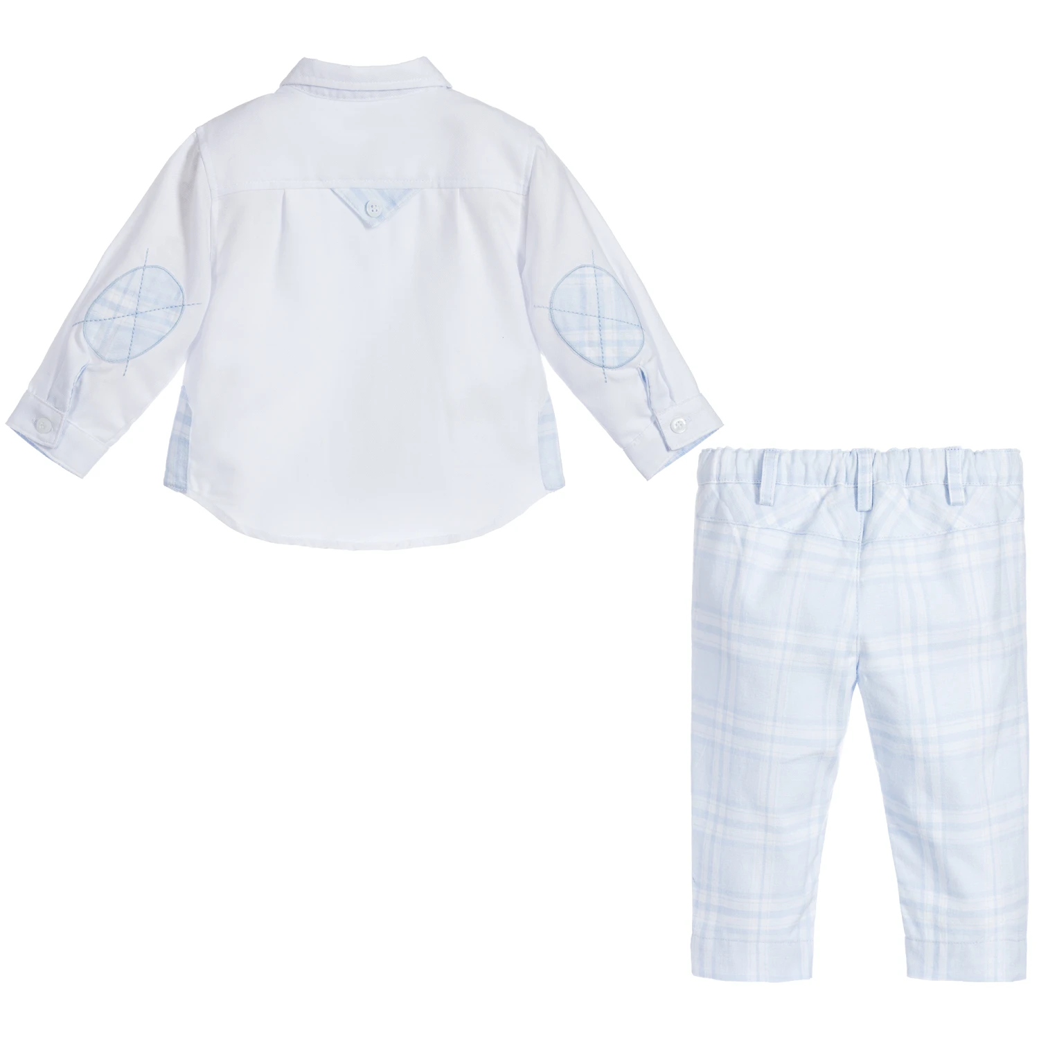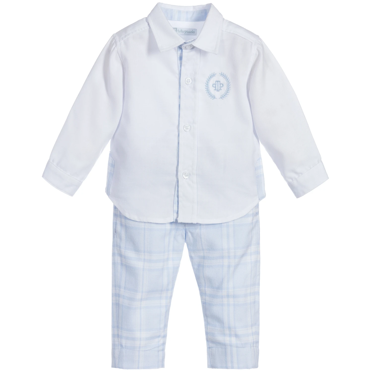 Three piece outfit for boys by Tutto Piccolo, comprising a pale blue knitted cardigan and blue cotton shirt, with pale blue and white checked flannel trousers. The cardigan is softly knitted and has a shawl collar.