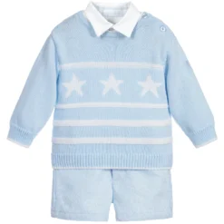 Pale blue four piece outfit for little boys by Tutto Piccolo, comprising a sweater, shirt, shorts and socks. The super soft sweater is knitted in a cotton and angora wool blend, with white stripes and stars in the weave. The white shirt has pale blue tartan trims with elbow patches and the brand’s logo embroidered on the front. The shorts have a useful adjustable waistband and they come with mid-length socks.