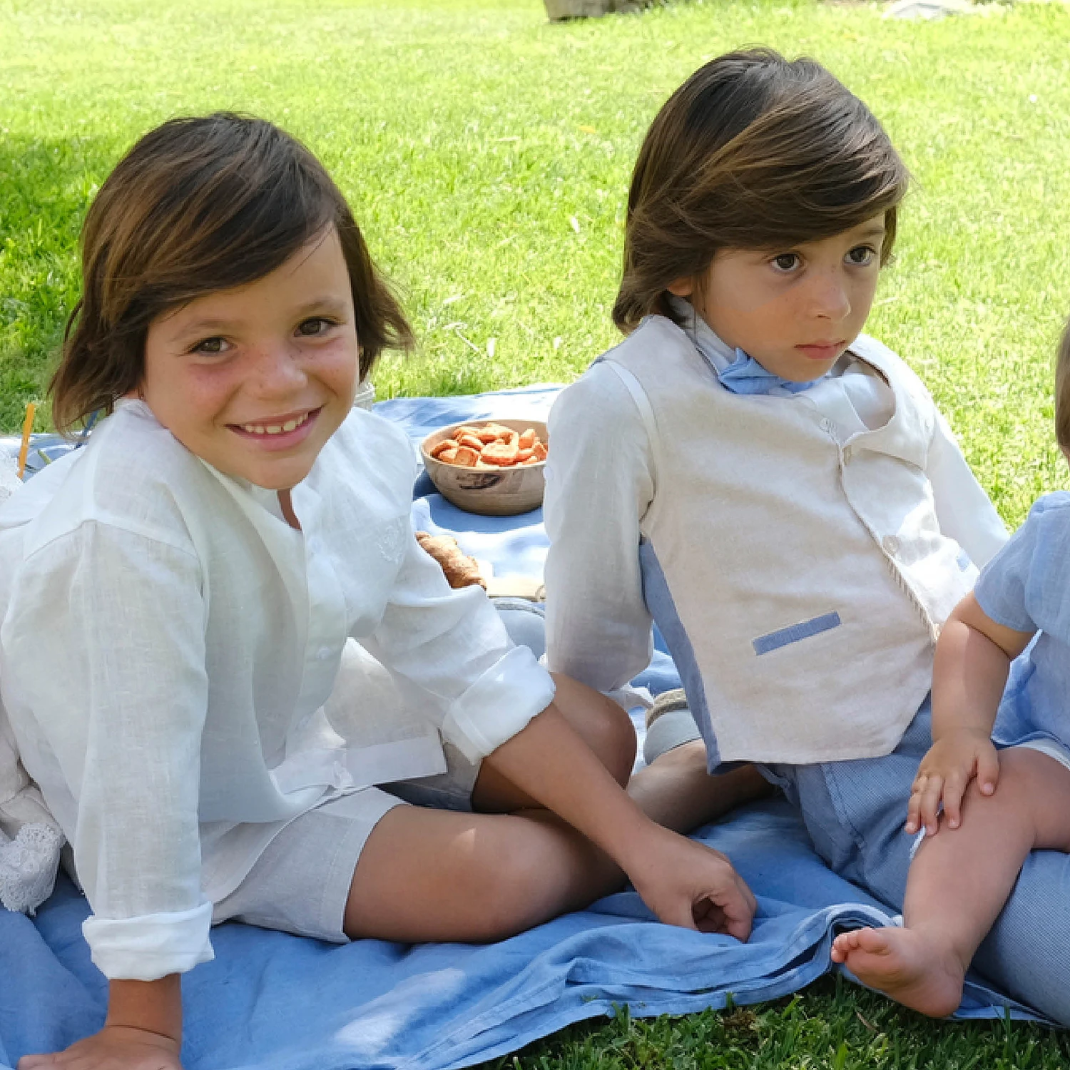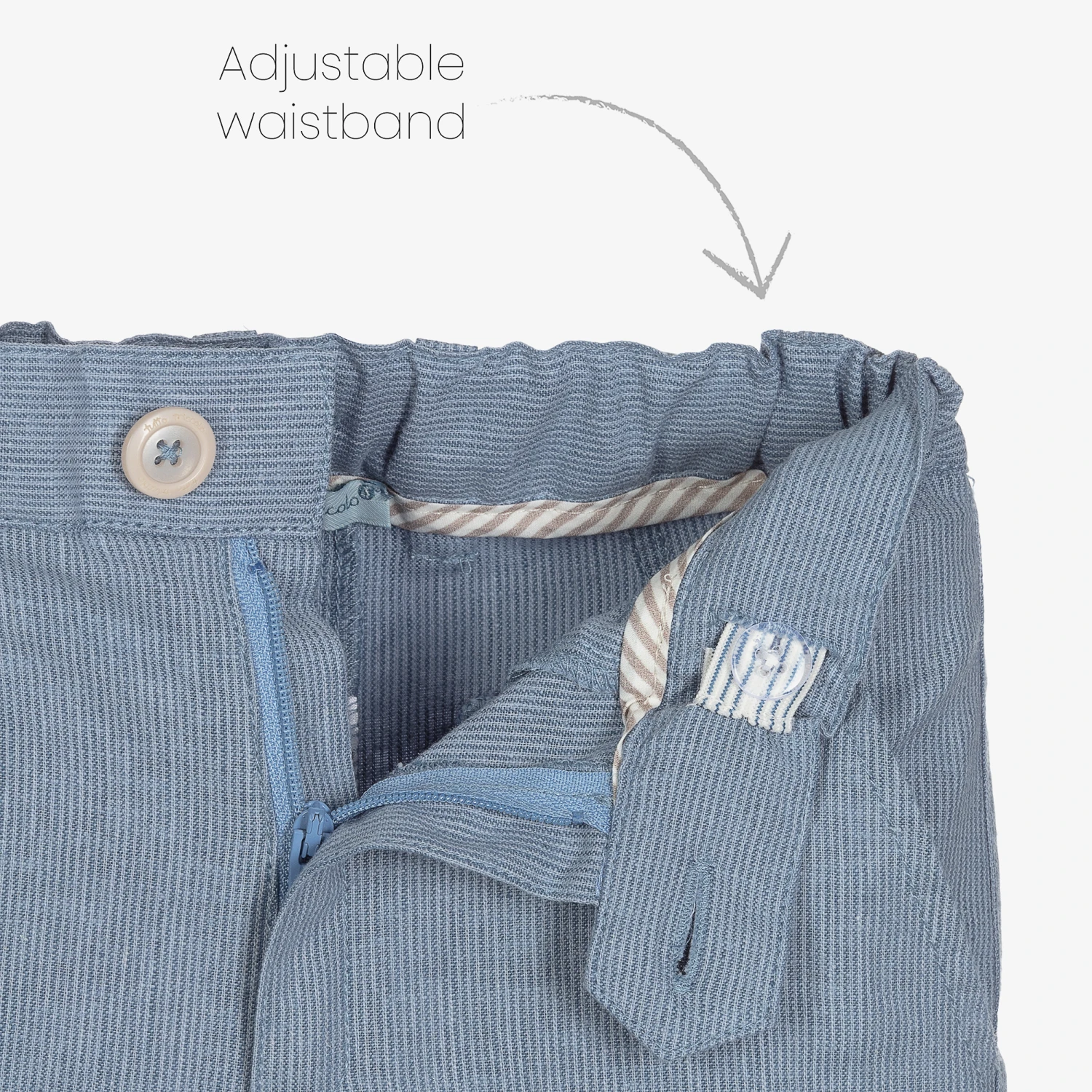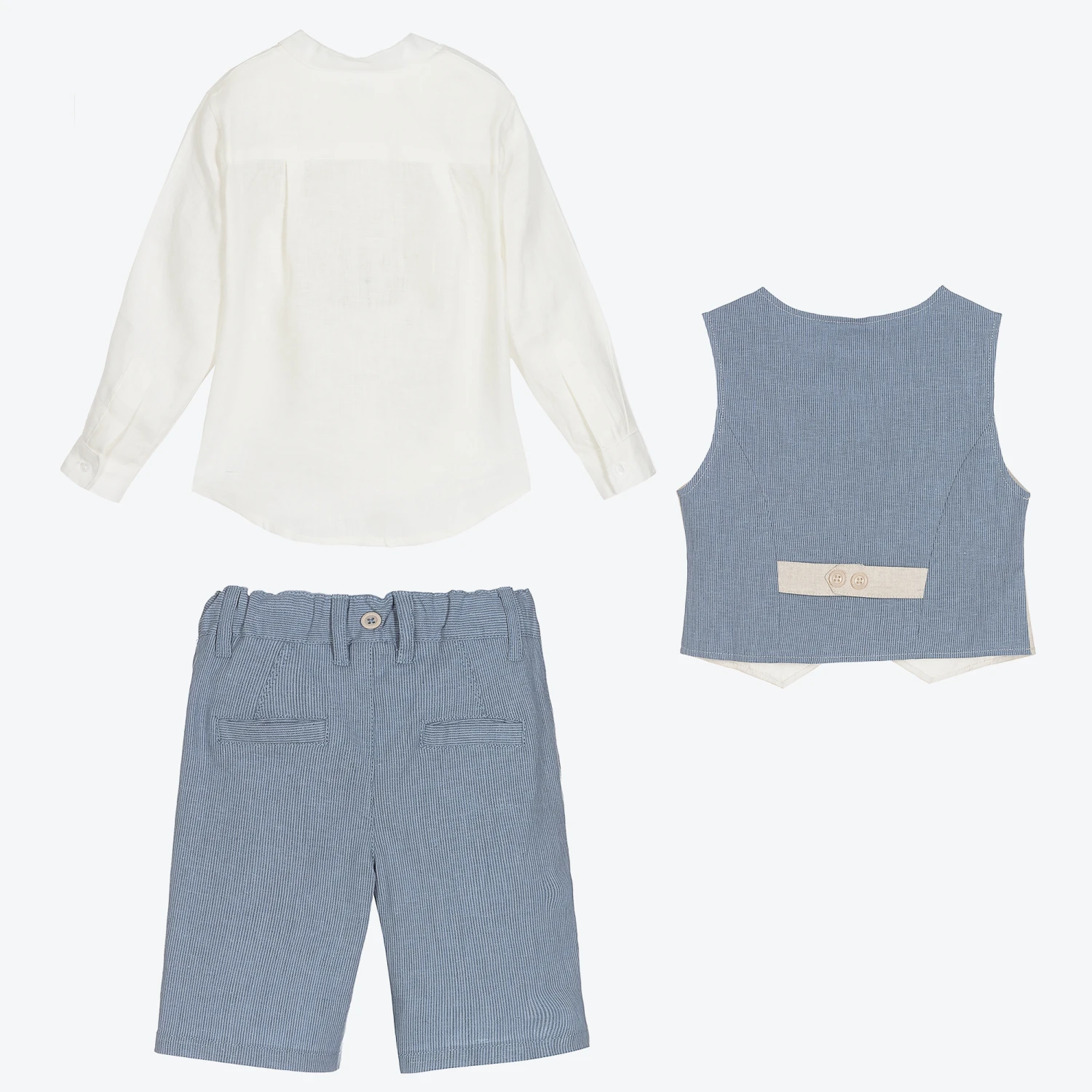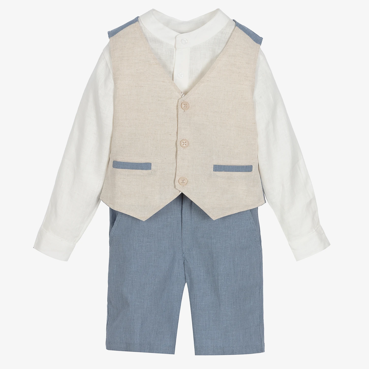 Boys three-piece, beautifully tailored linen blend shorts set in beige and blue, by Tutto Piccolo. The ivory collarless shirt has an embroidered logo on the chest and branded button fastenings. The beige waistcoat has a striped blue back and pocket trim to match the shorts. The shorts have an adjustable waistband with zip and button fastening, and buttons for attaching braces (not included). They have useful pockets on the front and back.