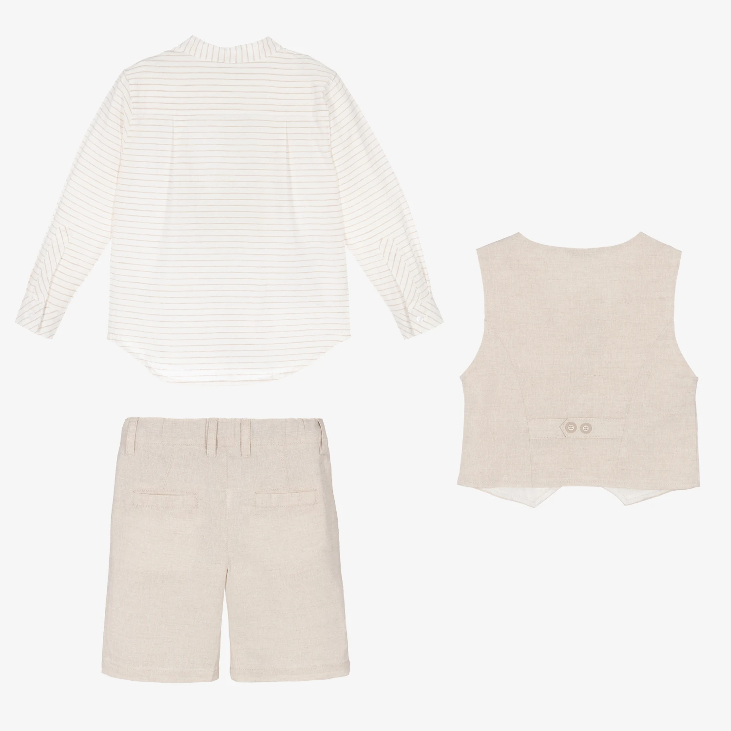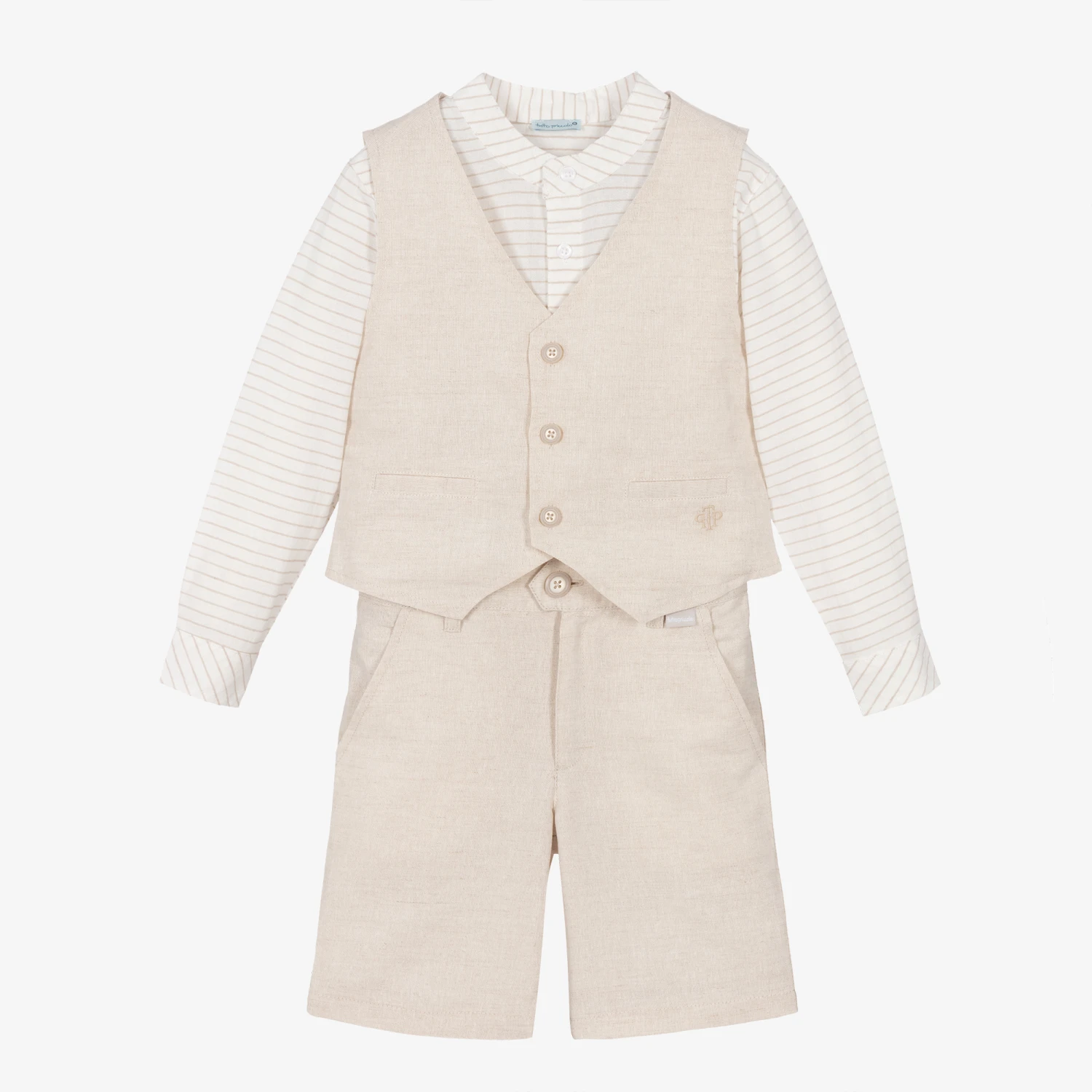 Beige and ivory shorts set for boys by Spanish brand Tutto Piccolo. Made in a lightweight cotton and linen blend, the shirt is designed in a horizontal stripe with front button fastenings and logo embroidery on the chest. The striped shorts have a button and zip fastening on the front, along with an adjustable waistband for a great fit. For a smart look, the set includes a charming beige waistcoat with front button fastenings, logo detailing, and jetted pockets.