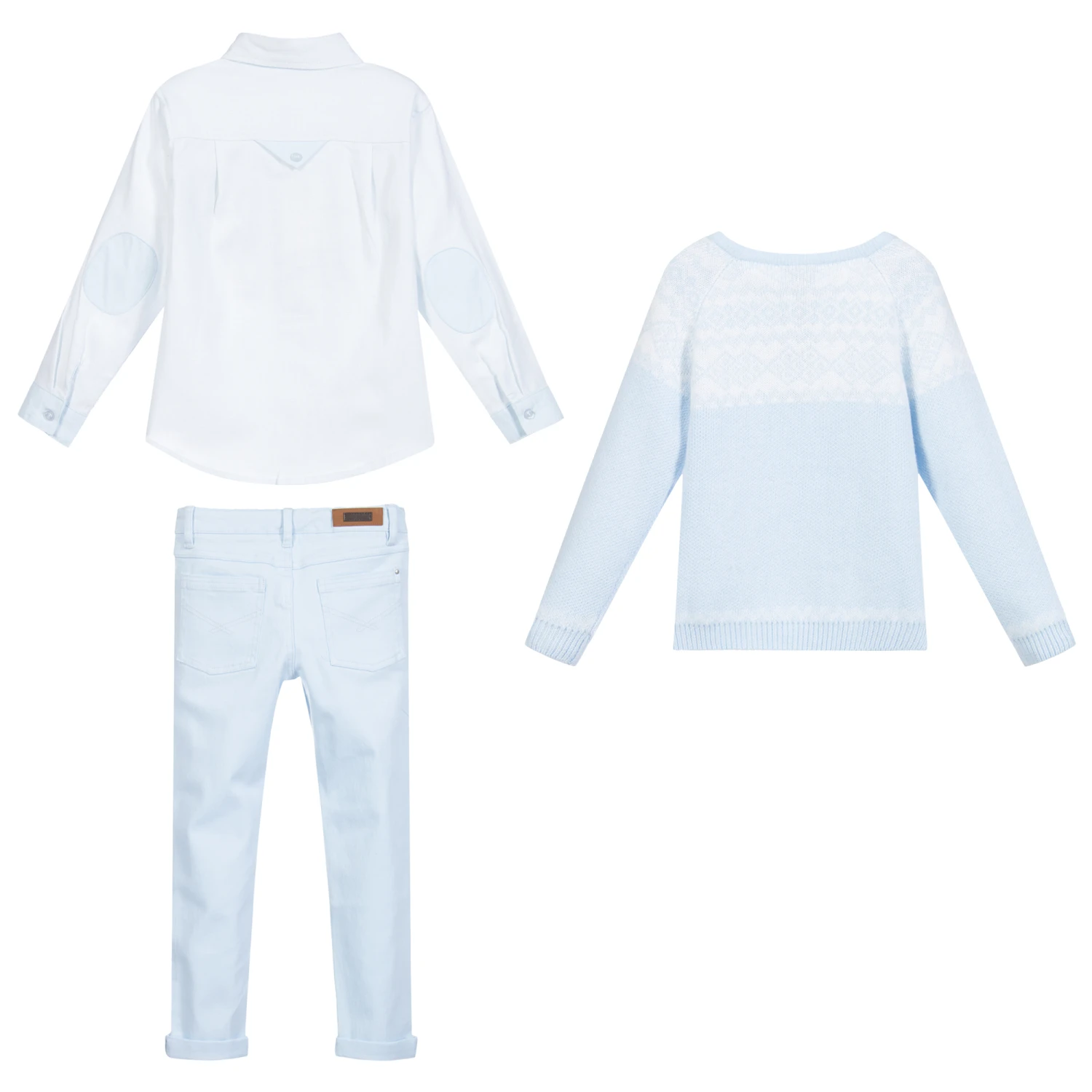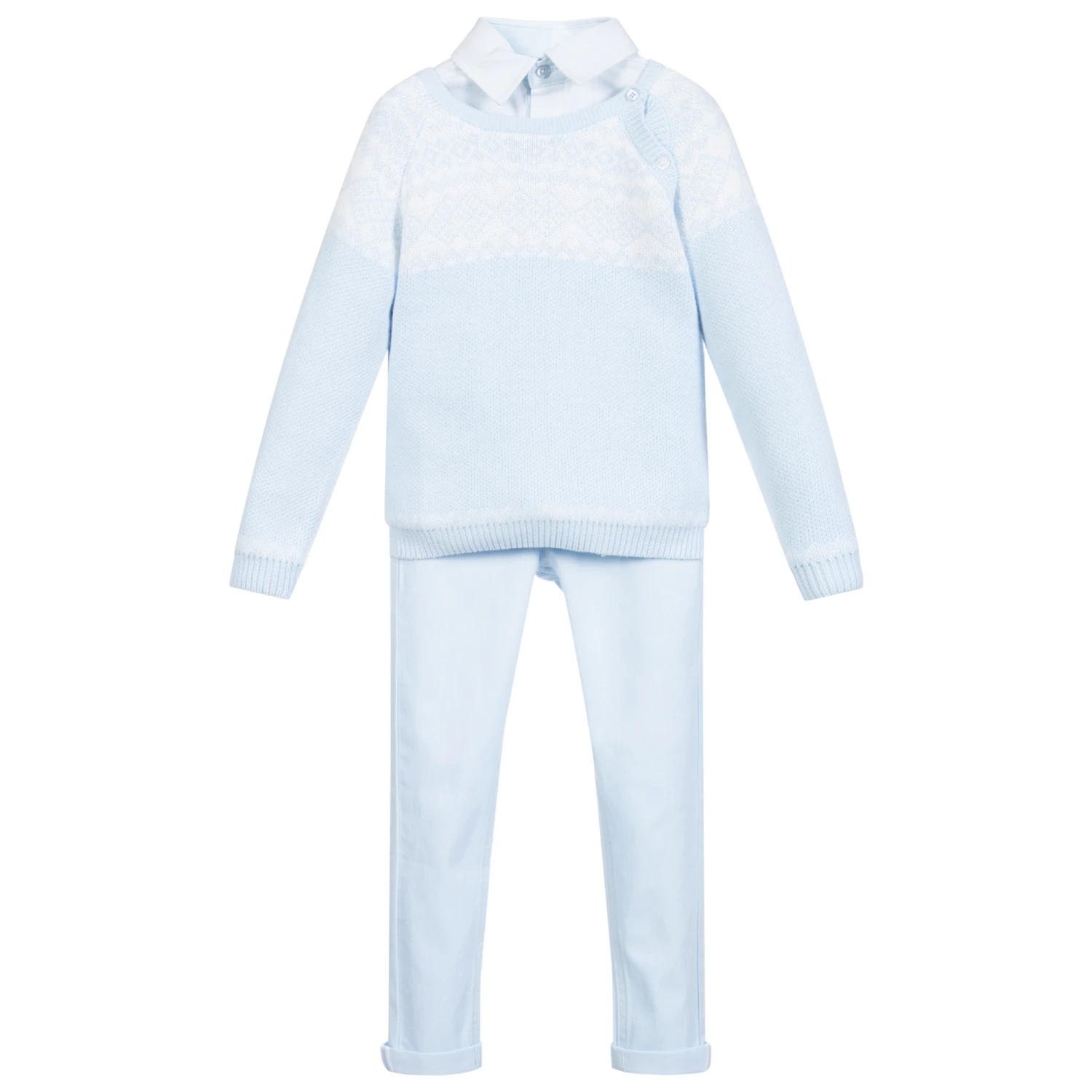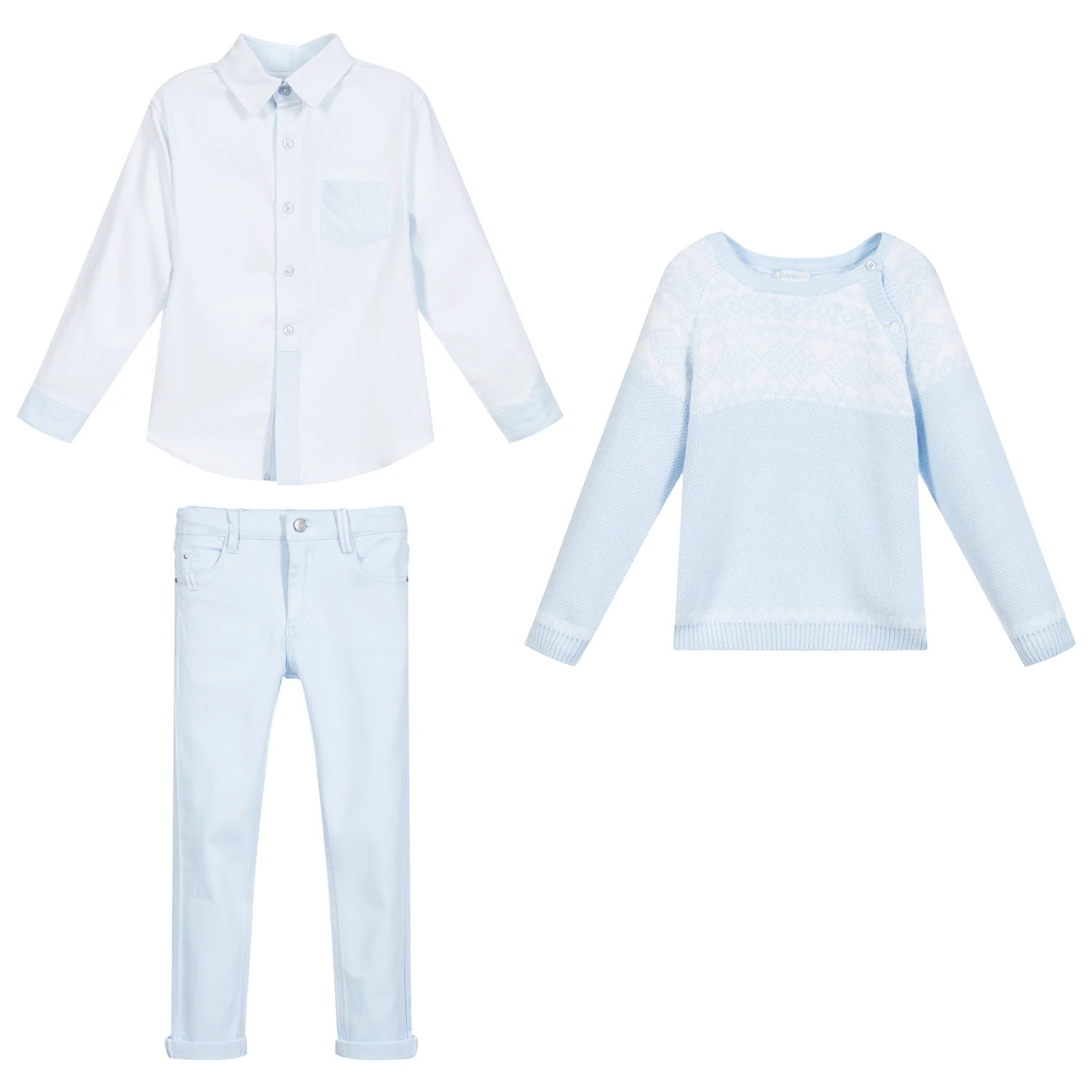 Pale blue trousers set for boys by Tutto Piccolo. Knitted in a soft blend of cotton, wool and polyamide, the jumper has a white Fair Isle style trim and front button fastenings. The blue shirt is made in a soft blend of viscose and cotton with blue cotton poplin trims and an embroidered white logo on the chest pocket. The pale blue jeans are made in soft stretch denim with five pockets and an adjustable waist.