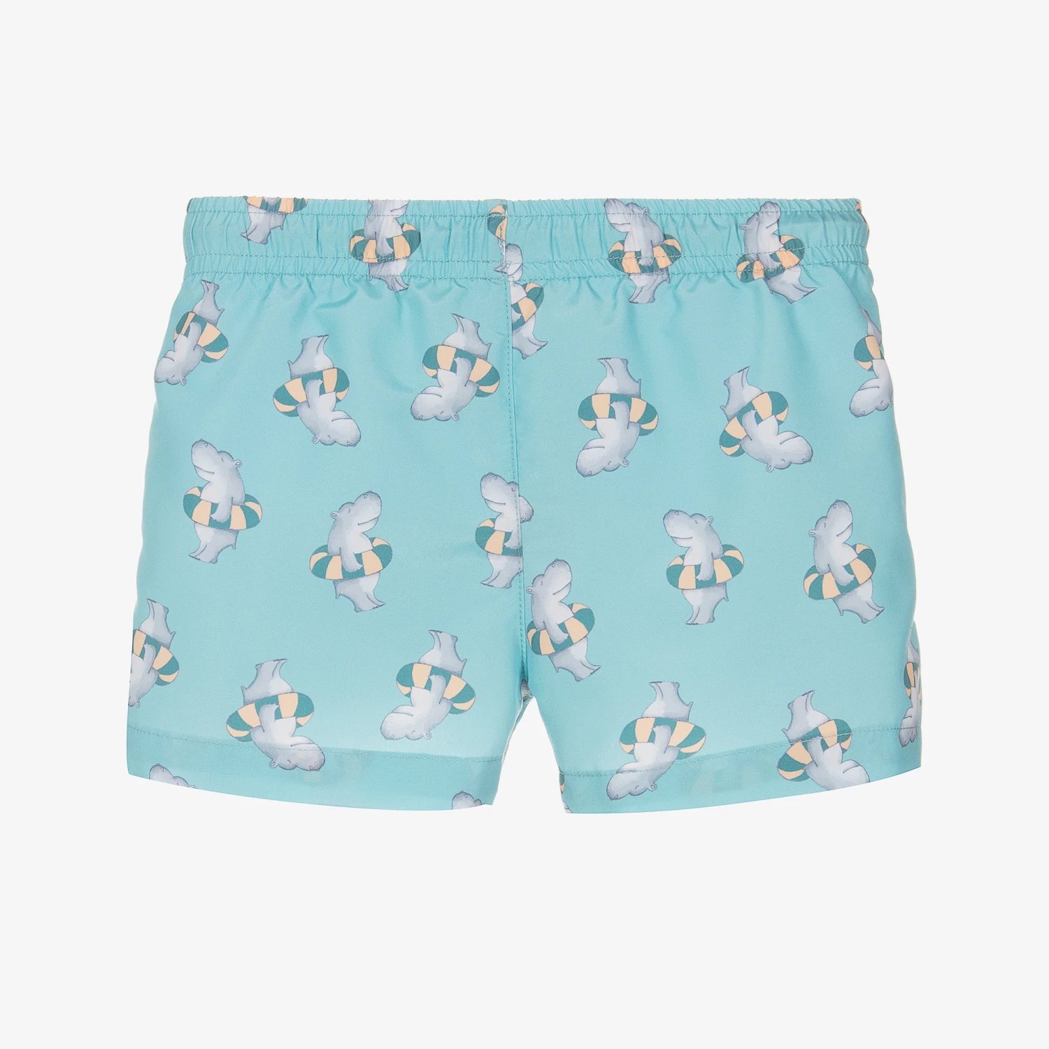 Aqua green swim shorts for boys by Tutto Piccolo, with a fun bathing hippopotamus pattern. Easy-to-wear in the pool or at the beach, these smooth shorts have stretchy drawstring ties for the best fit around the waist. They are comfortably finished with a breathable mesh lining.