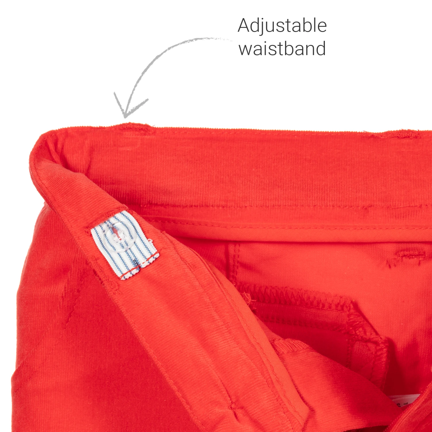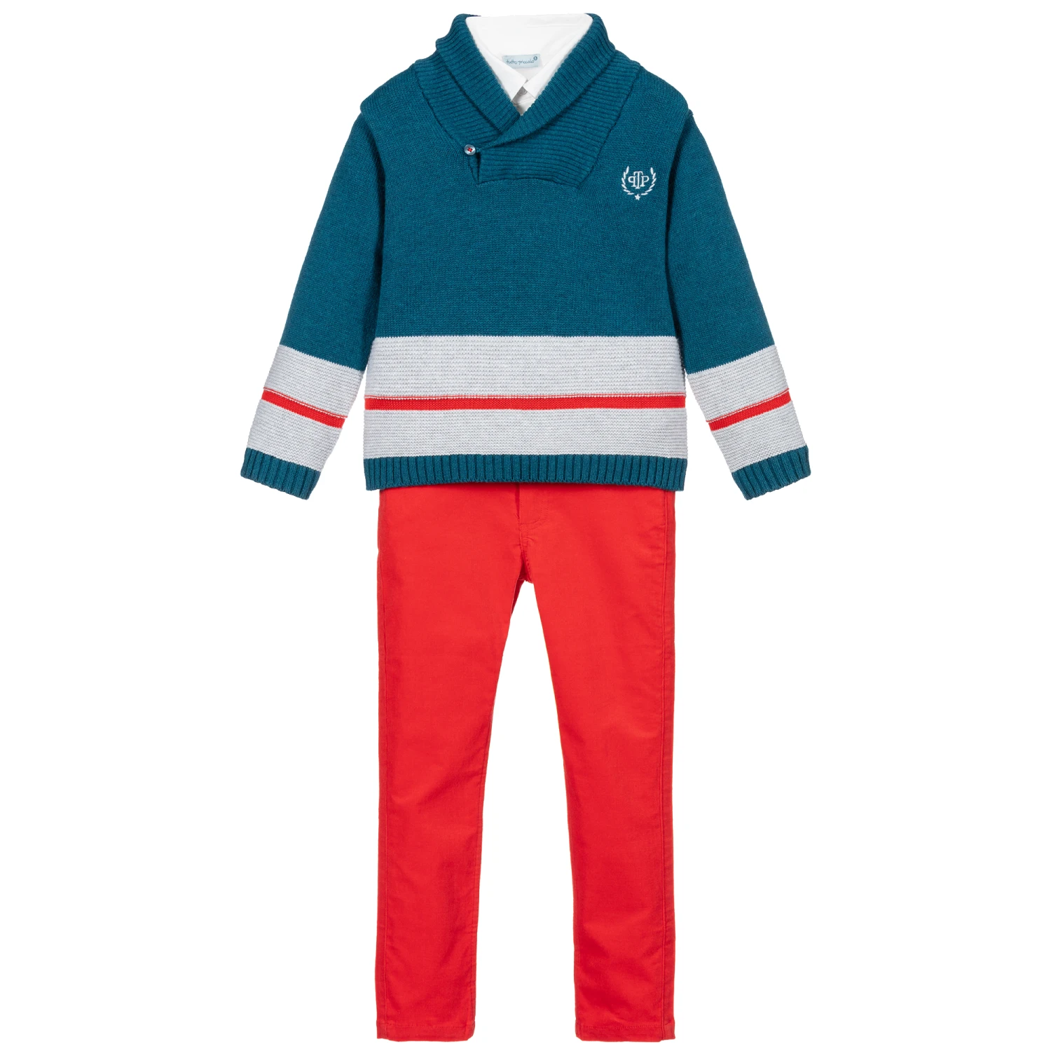 Shirt, sweater and trousers set by Tutto Piccolo. The white cotton shirt has the brand’s embroidered logo on one side. The red trousers are made in fine corduroy and have a useful adjustable waistband. The teal green sweater is knitted in cotton and has grey and red stripes, an embroidered logo and a shawl collar.