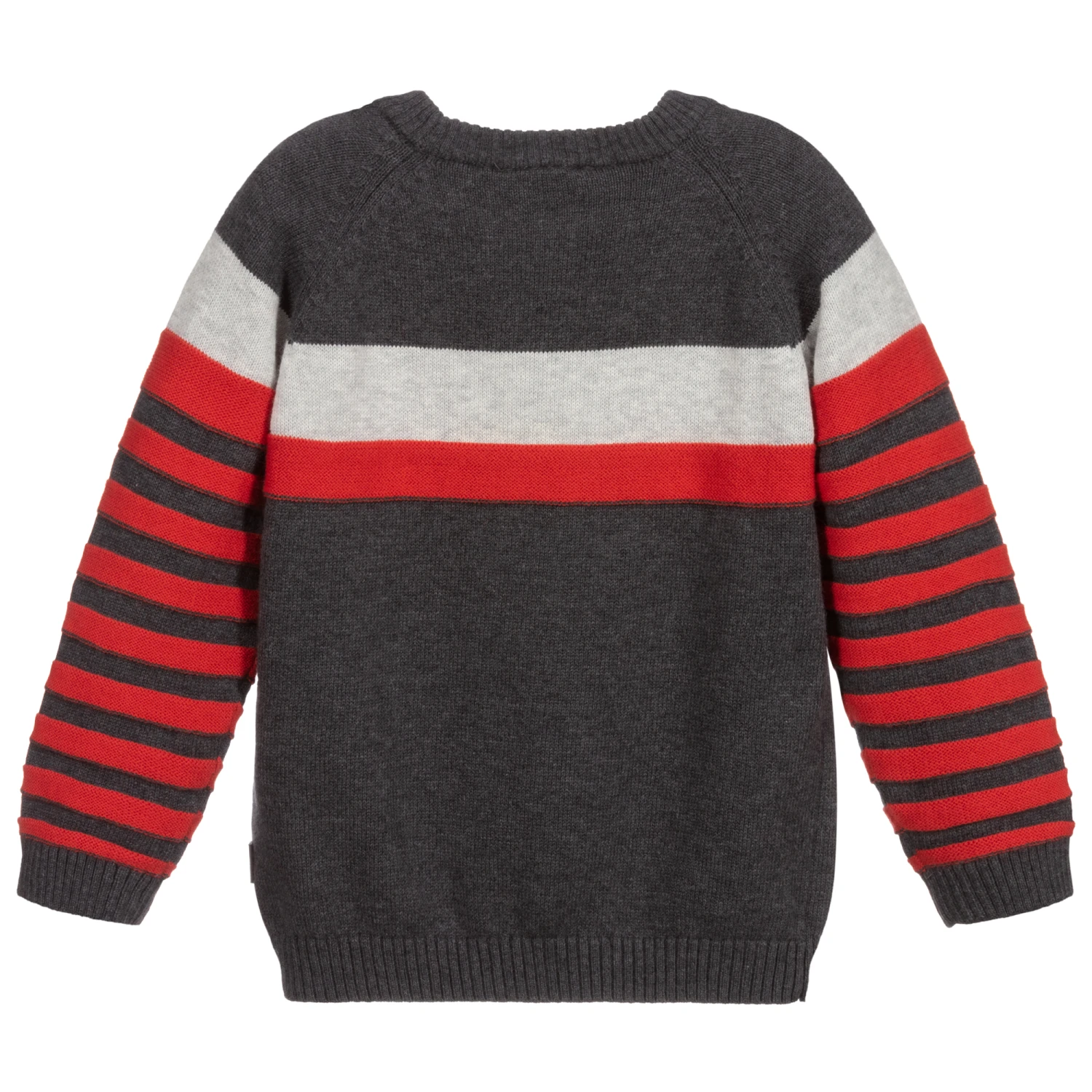 Grey sweater by Tutto Piccolo, with pale grey and raised red stripes. It is knitted in a cosy cotton and Angora wool blend.