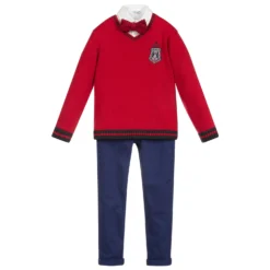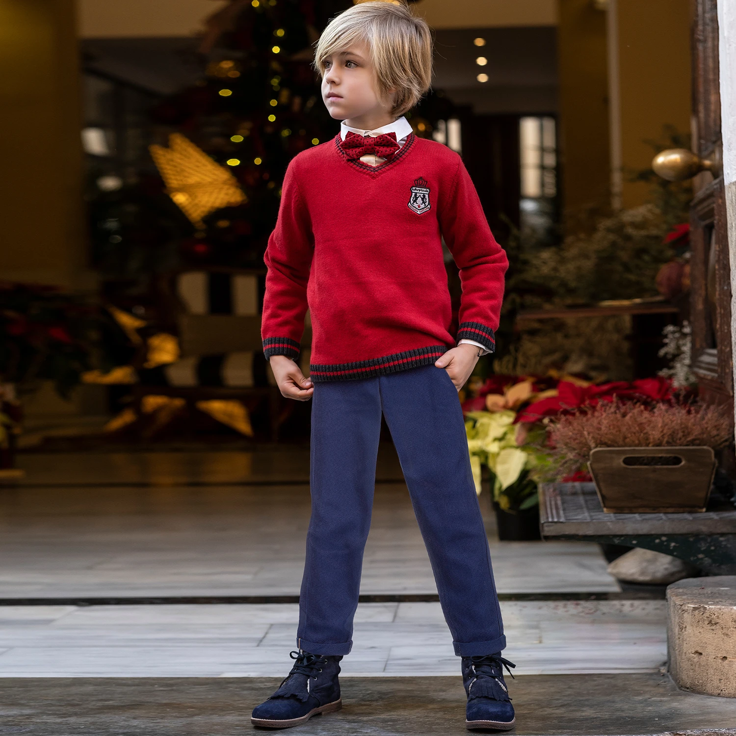 Red and blue trousers set for boys by Tutto Piccolo. The ivory shirt is made in soft, slightly stretchy cotton with concealed front button fastenings and an embroidered white logo on the chest. The mid-weight jumper is made in a soft blend of cotton, wool and polyamide with a grey felt logo patch on the chest and dark grey trims. A pair of navy blue stretch denim jeans and a red bow tie with a navy blue polka dot pattern complete the set.