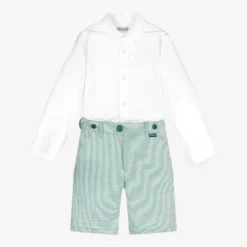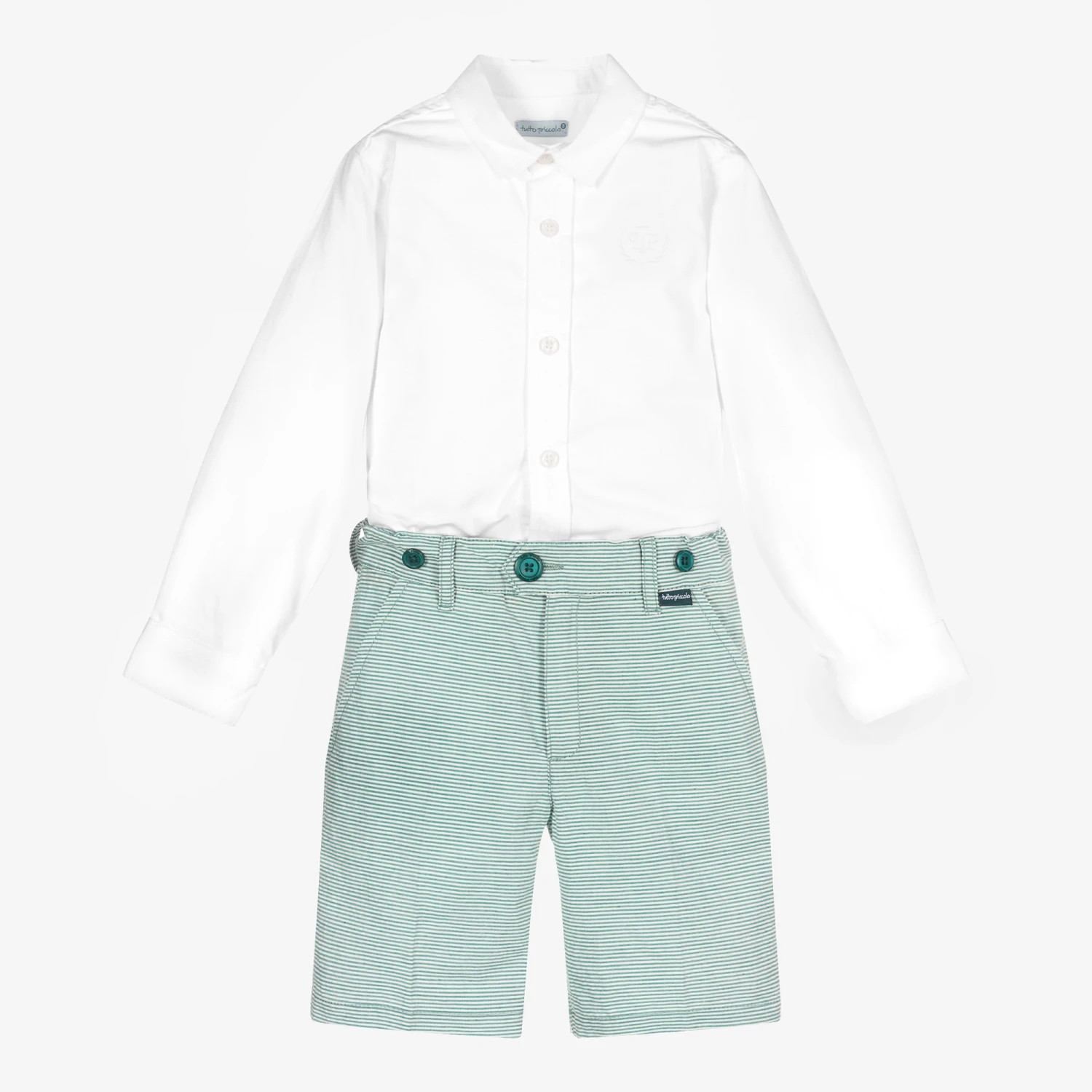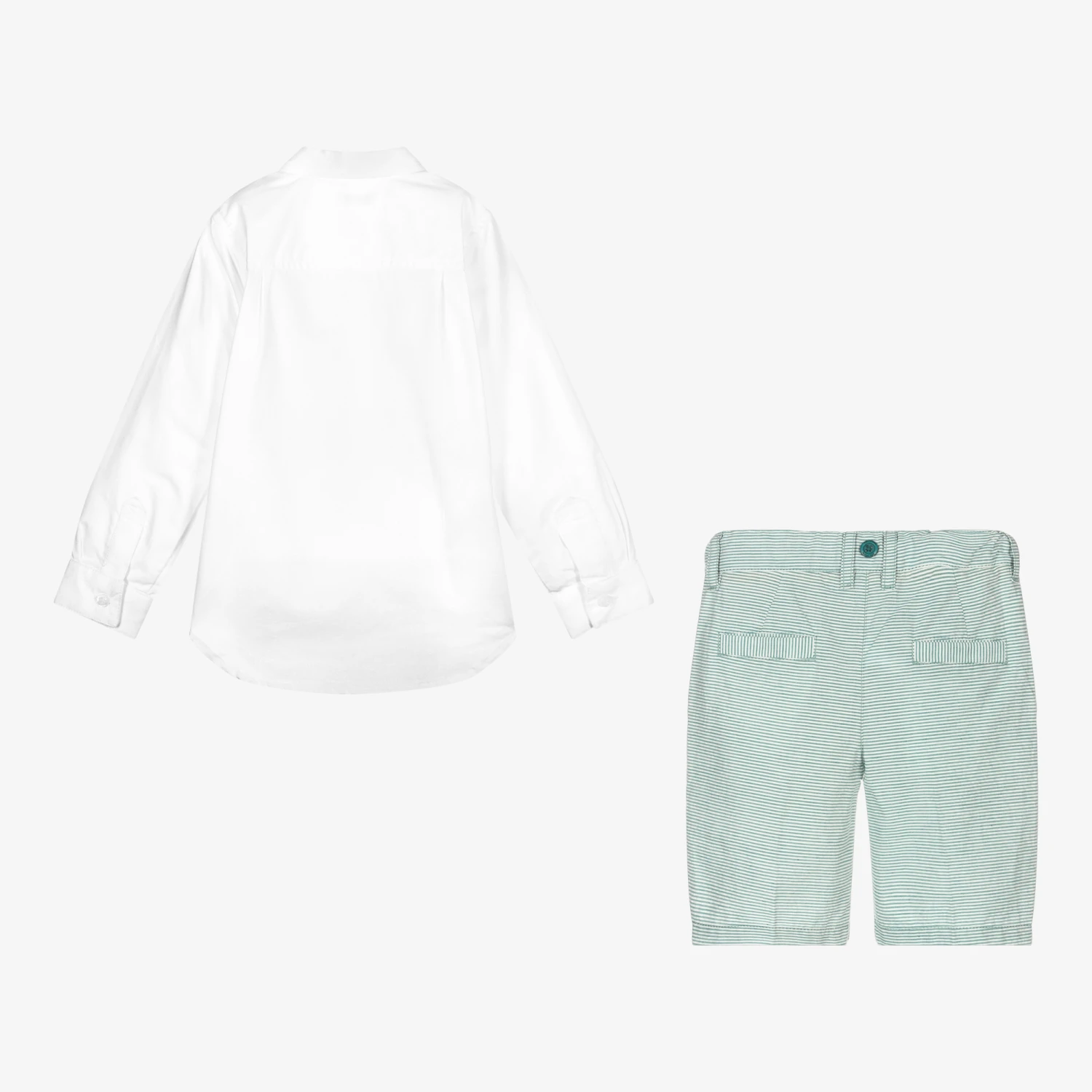 White and green shirt and shorts set for boys by Tutto Piccolo, made in soft organic cotton twill. The white button-up shirt has white logo embroidery on the front. The green striped shorts have green button details and a logo tab on the front. They have an adjustable waist, four pockets and fasten with a zip and button.