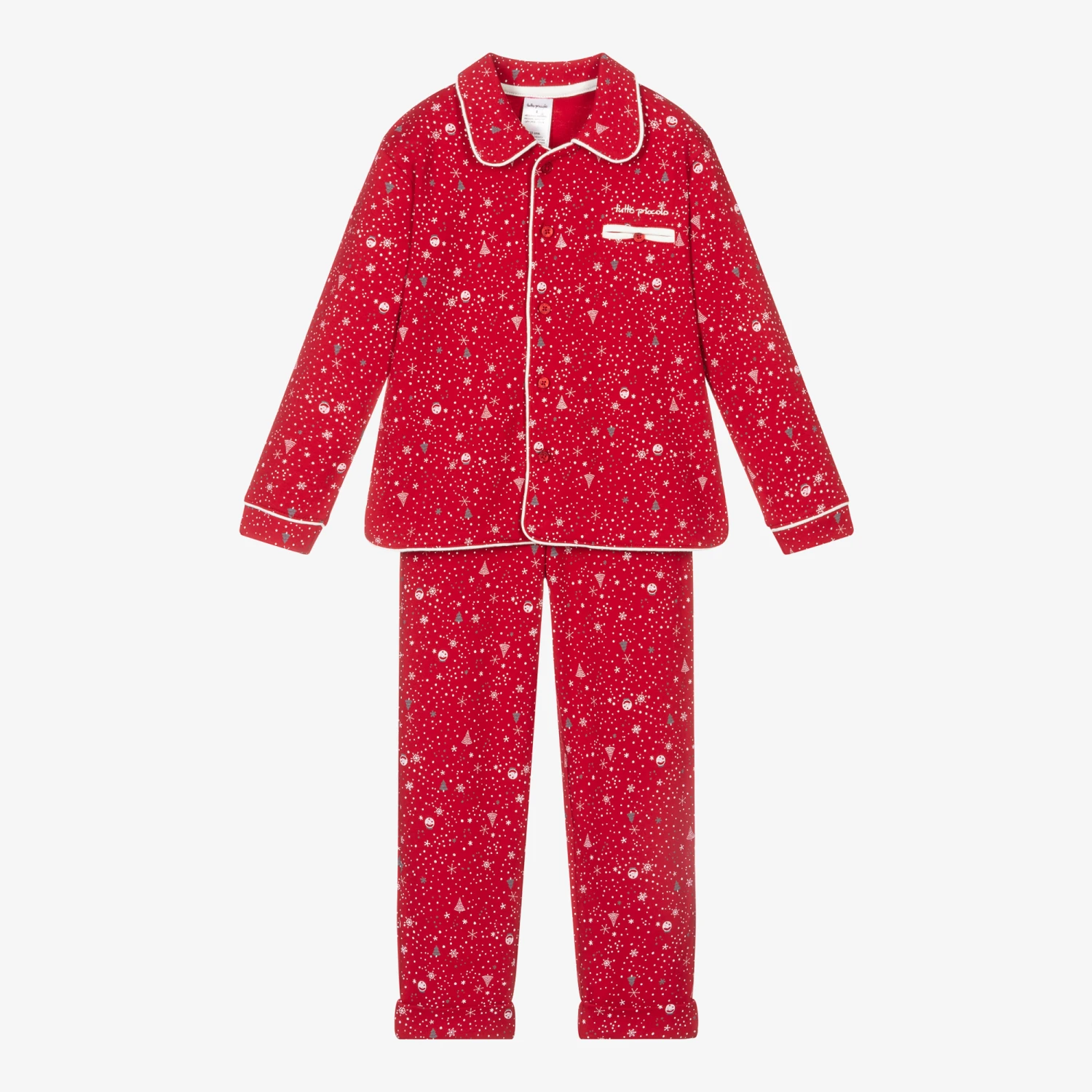 Red pyjamas for boys and girls by Tutto Piccolo, with a lovely festive pattern in ivory and grey. Made in soft and comfortable cotton jersey, the top has smart ivory trim, branded button fastenings, and ivory logo embroidery above a faux pocket. The trousers have turn-ups and a gently elasticated waistband.