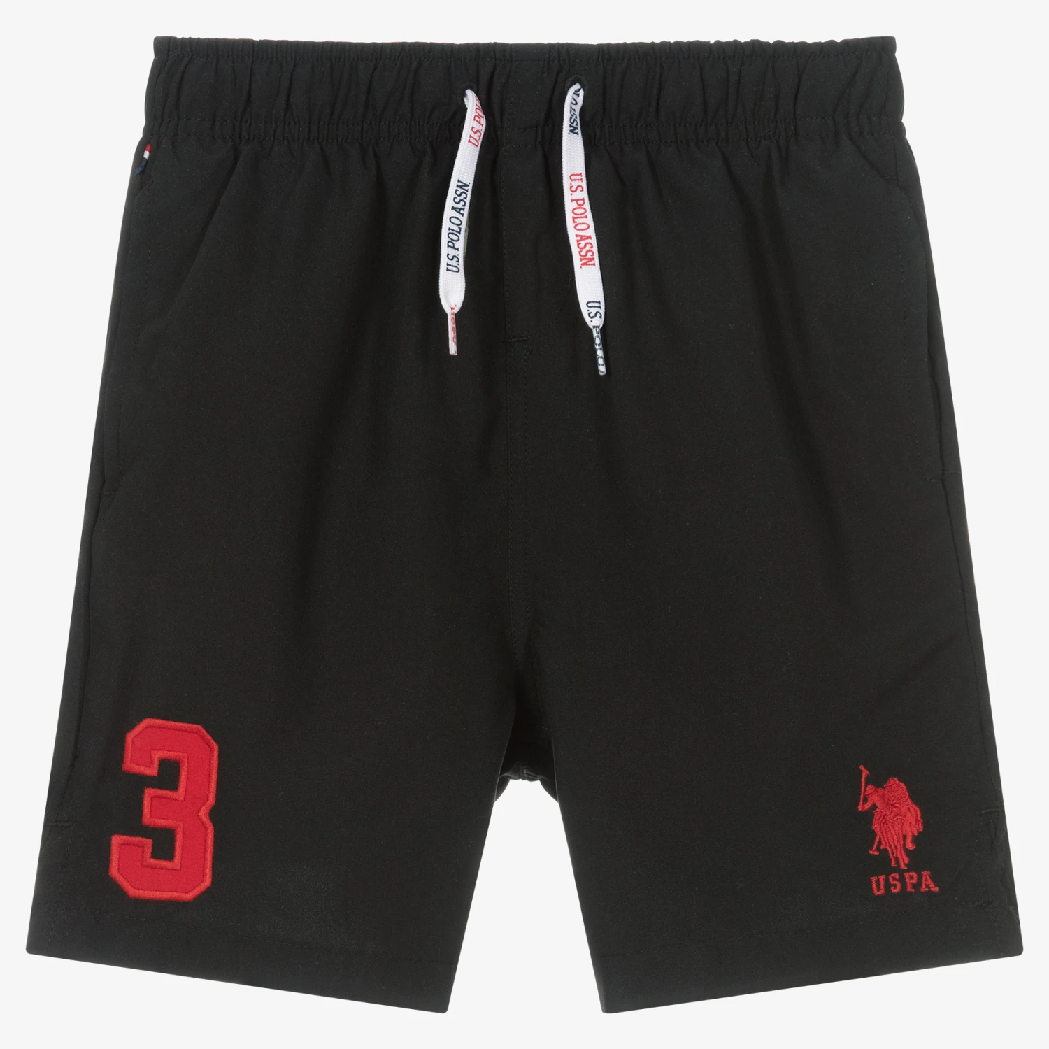 Silky smooth and lightweight, these black swim shorts for boys are by U.S. Polo Assn.. They are lined in soft mesh for comfort and have have an elasticated drawstring waist for a good fit. The brand’s iconic double horseman logo is embroidered on one leg in red, with a number ‘3’ appliquéd on the other.