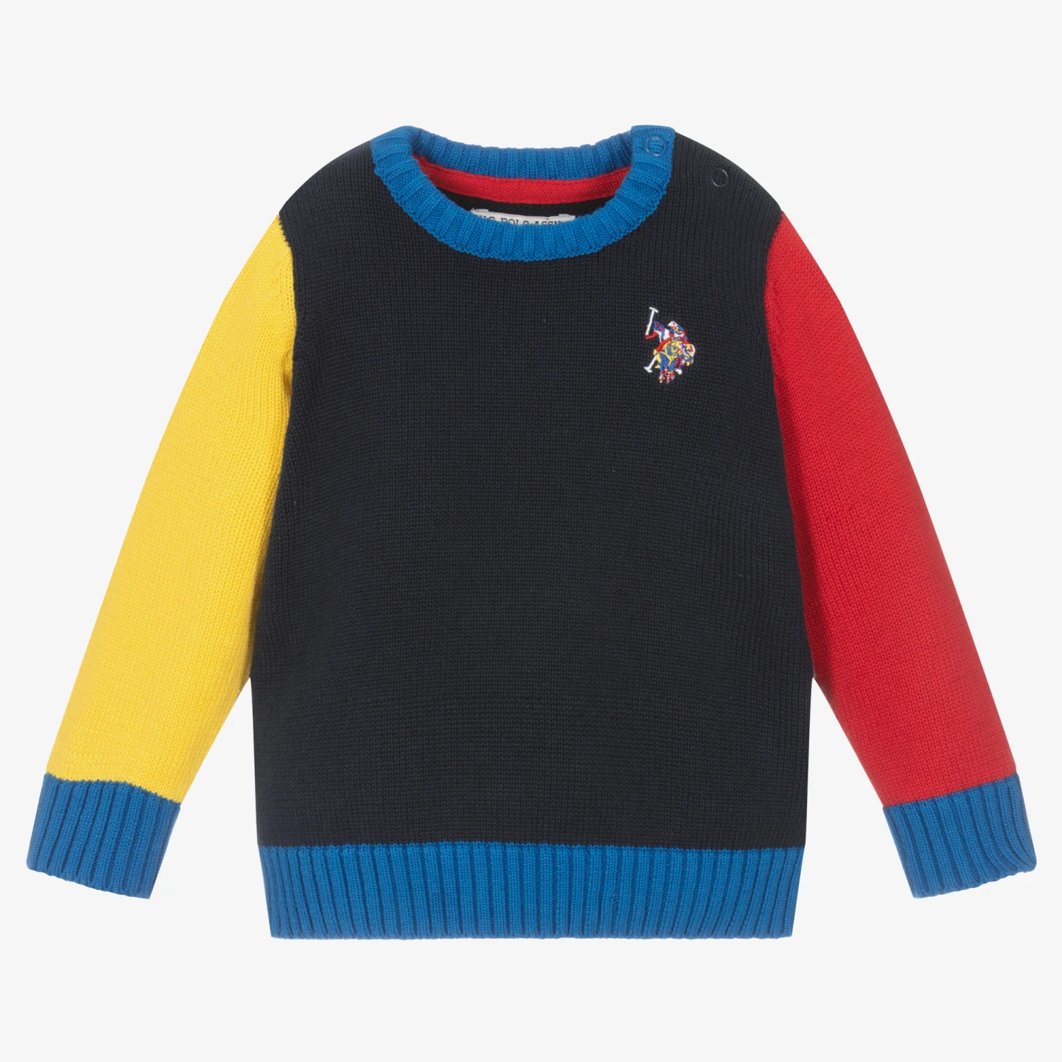 Navy blue sweater for little boys by U.S. Polo Assn., made in a soft and cosy cotton knit. In a colourblock design, this warm layer has red and yellow sleeves and bright blue, ribbed trims. The brand’s double horseman logo is embroidered on the chest in coordinating colours. On the smaller sizes, there are popper fastenings on one shoulder to help with dressing.