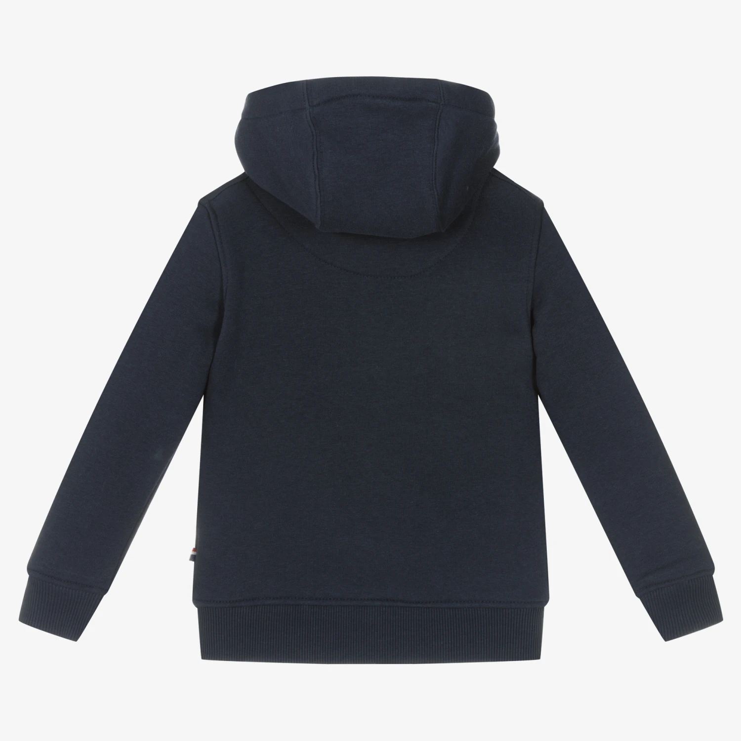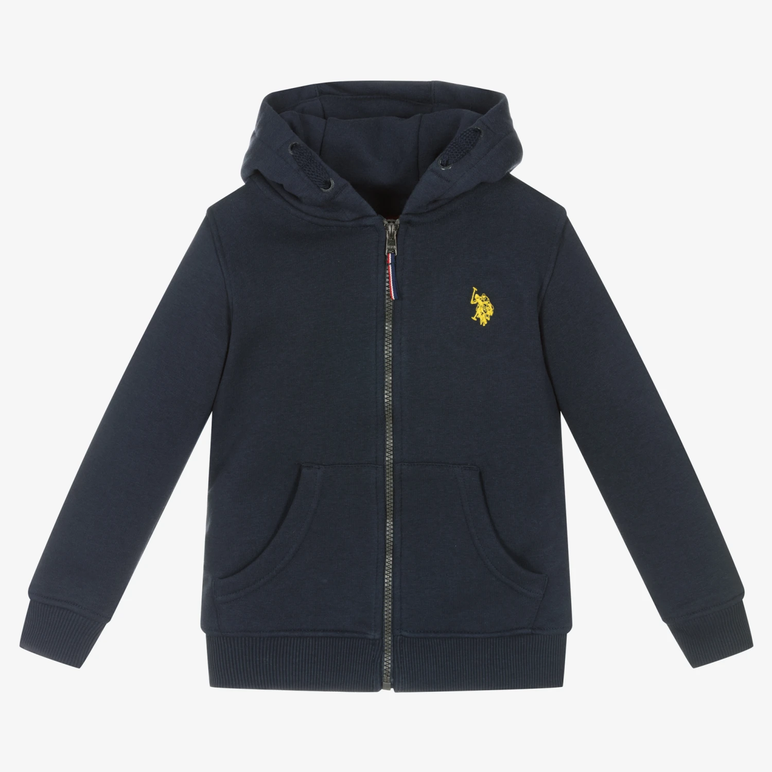 Navy blue hooded zip-up top for boys by U.S. Polo Assn., made in soft cotton sweatshirt jersey with a cosy fleece feel inside. The brand’s double horseman logo is embroidered in yellow on the chest. To complete the look, there is a pouch pocket on the front and a faux drawstring detail on the hood.